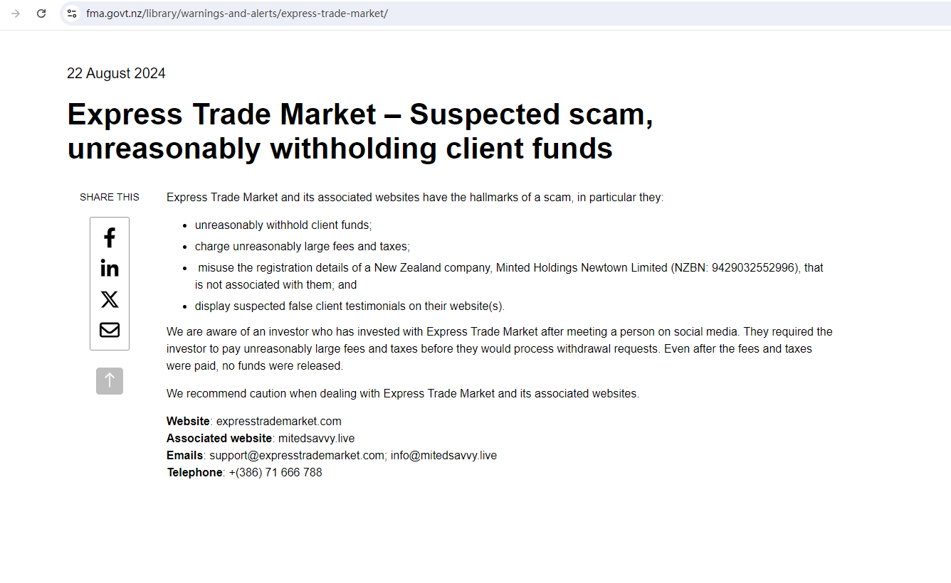 22 de agosto de 2024 express trade market – sospecha de estafa, retención irrazonable de fondos de clientes share this express trade market y sus sitios web asociados tienen características de estafa, en particular: retienen fondos de clientes de manera irrazonable; cobran tarifas e impuestos irrazonablemente altos; hacen un mal uso de los datos de registro de una empresa de nueva zelanda, minted holdings newtown limited (nzbn: 9429032552996), que no está asociada con ellos; y muestran testimonios de clientes supuestamente falsos en sus sitios web. sabemos de un inversor que ha invertido en express trade market después de conocer a una persona en las redes sociales. exigieron al inversor que pagara tarifas e impuestos irrazonablemente altos antes de procesar las solicitudes de retiro. incluso después de que se pagaron las tarifas y los impuestos, no se liberaron fondos. recomendamos tener cuidado al tratar con express trade market y sus sitios web asociados. sitio web: expresstrademarket.com sitio web asociado: mitedsavvy.live correos electrónicos: support@ expresstrademarket.com ; info@mitedsavvy.live teléfono: +(386) 71 666 788