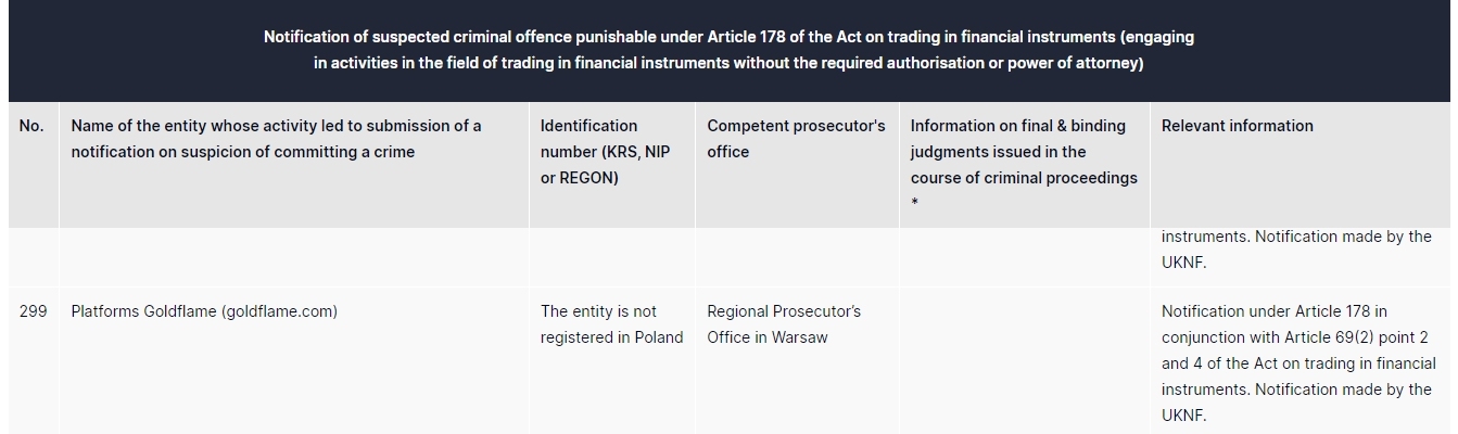 plataformas GoldFlame ( GoldFlame .com) la entidad no está registrada en la oficina del fiscal regional de polonia en varsovia notificación de conformidad con el artículo 178 en relación con el artículo 69(2) puntos 2 y 4 de la ley sobre comercio de instrumentos financieros. notificación realizada por la uknf.