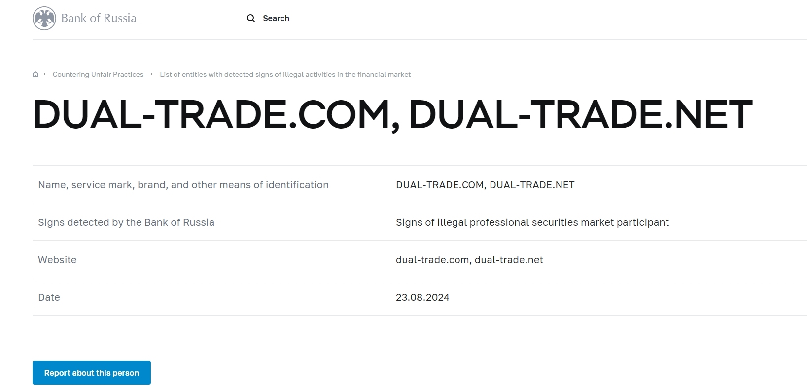 Nombre, marca de servicio, marca y otros medios de identificación DUAL-TRADE.COM, DUAL-TRADE.NET Signos detectados por el Banco de Rusia Signos de participante profesional ilegal del mercado de valores Sitio web dual-trade.com, dual-trade.net Fecha 23.08.2024