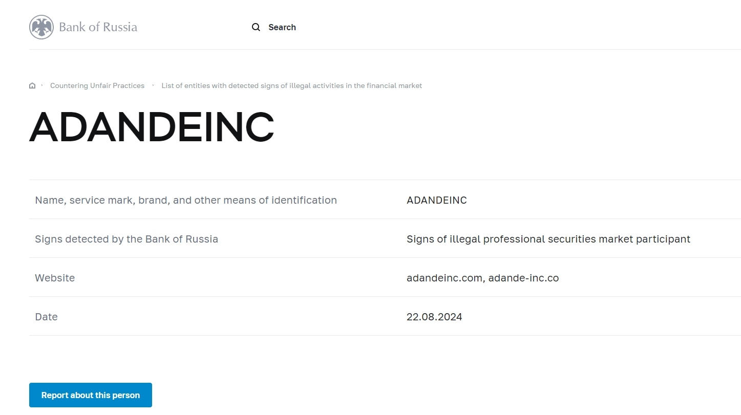 Nombre, marca de servicio, marca y otros medios de identificación ADANDEINC Signos detectados por el Banco de Rusia Signos de participante profesional ilegal del mercado de valores Sitio web adandeinc.com, adande-inc.co Fecha 22.08.2024