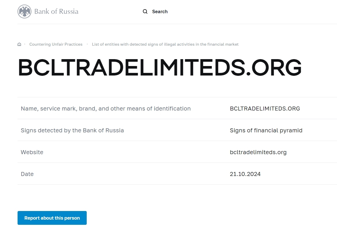 Nombre, marca de servicio, marca y otros medios de identificación BCLTRADELIMITEDS.ORG Signos detectados por el Banco de Rusia Signos de pirámide financiera Sitio web bcltradelimiteds.org Fecha 21.10.2024