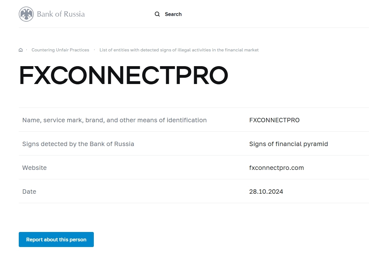 Nombre, marca de servicio, marca y otros medios de identificación FXCONNECTPRO Signos detectados por el Banco de Rusia Signos de pirámide financiera Sitio web fxconnectpro.com Fecha 28.10.2024