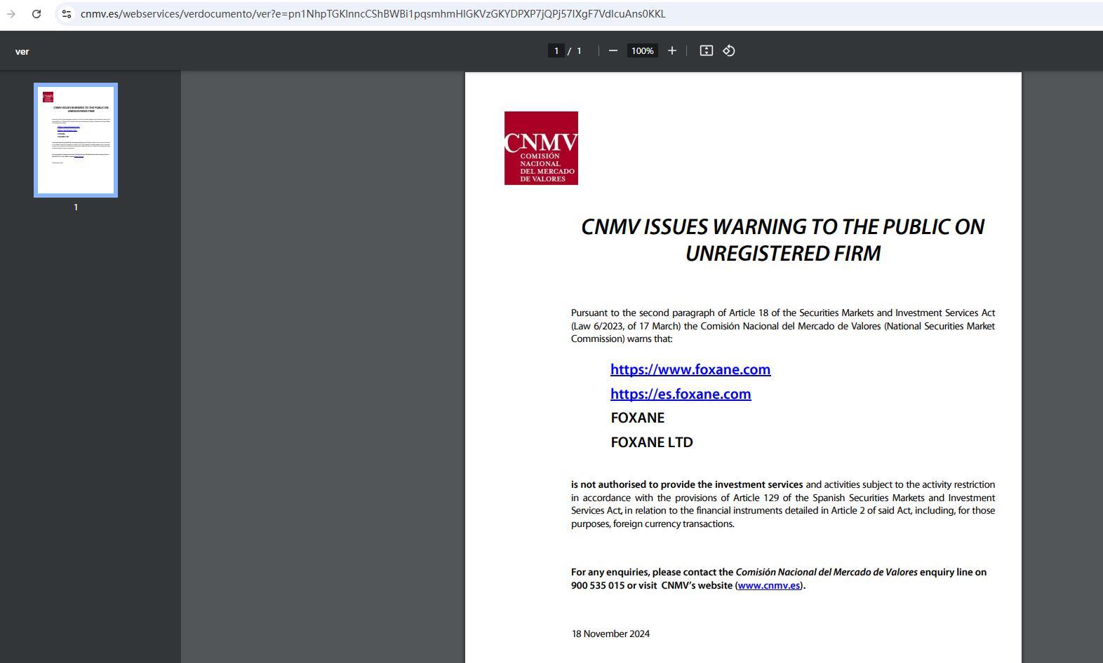 La Comisión Nacional del Mercado de Valores advierte al público sobre entidad no registrada En cumplimiento de lo dispuesto en el artículo 18, párrafo segundo, de la Ley 6/2023, de 17 de marzo, del Mercado de Valores, la Comisión Nacional del Mercado de Valores advierte de que: https://www. Foxane .com https://es. Foxane .com Foxane Foxane ltd no está autorizada a prestar los servicios y actividades de inversión sujetos a la restricción de actividad de acuerdo con lo establecido en el artículo 129 de la ley del mercado de valores y de servicios de inversión, en relación con los instrumentos financieros detallados en el artículo 2 de dicha ley, incluidas, a estos efectos, las operaciones en moneda extranjera. para cualquier consulta, puede dirigirse al teléfono de consultas de la comisión nacional del mercado de valores 900 535 015 o visitar la página web de la CNMV (www.cnmv.es). 18 de noviembre de 2024