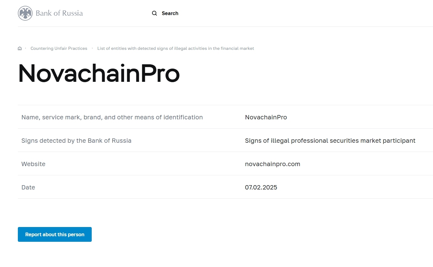 nombre, marca de servicio, marca y otros medios de identificación NovachainPro Señales detectadas por el Banco de Rusia: señales de un sitio web ilegal de un participante profesional del mercado de valores. NovachainPro .com fecha 07.02.2025