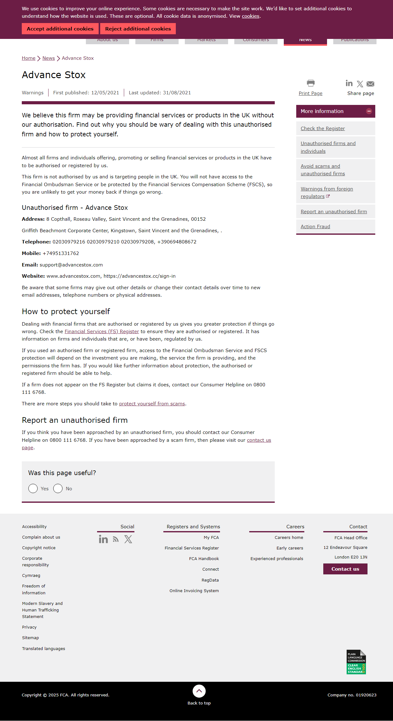 Lista de Advertencia de la FCA de empresas no autorizadas Advance Stox.