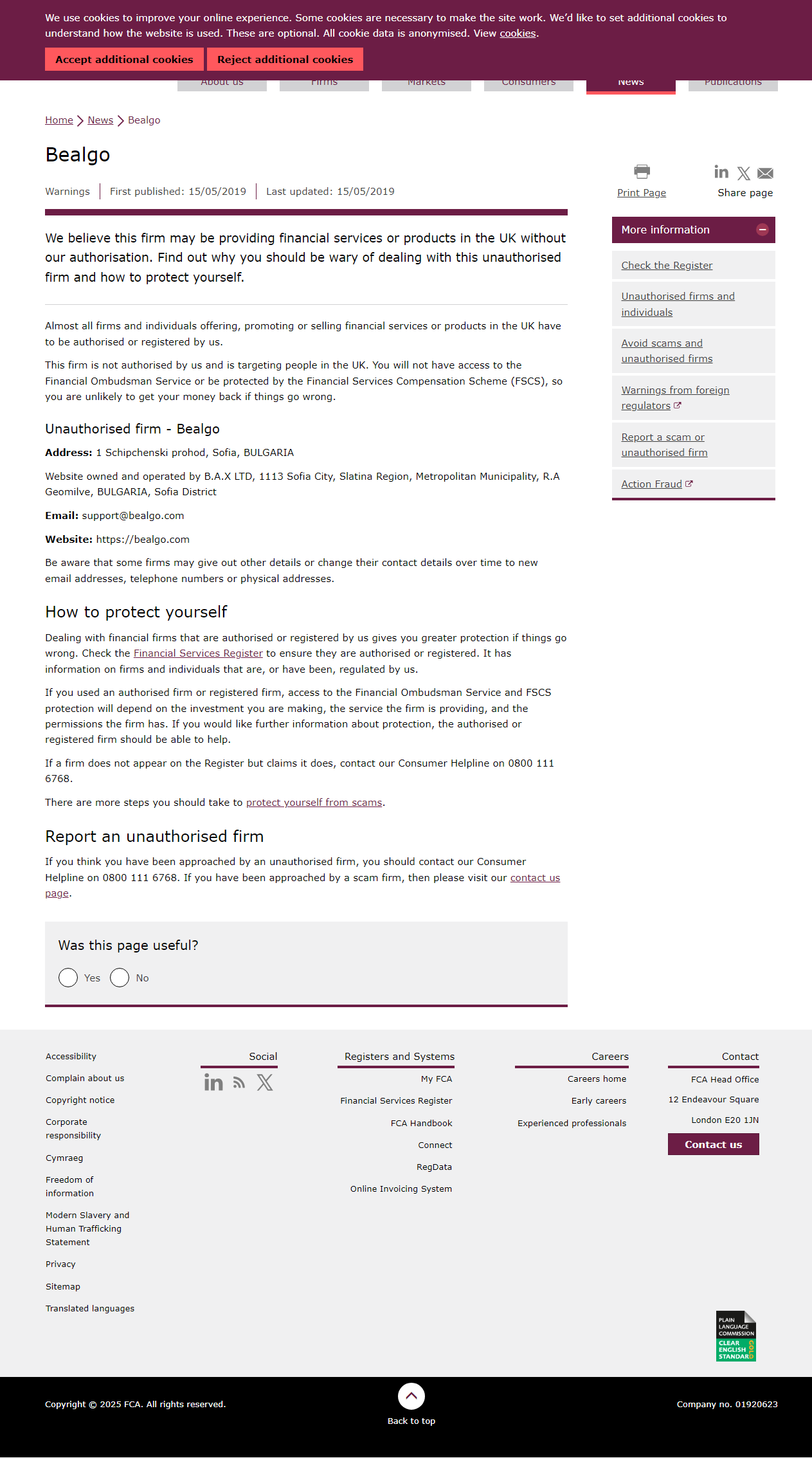['Creemos que esta empresa podría estar proporcionando servicios o productos financieros en el Reino Unido sin nuestra autorización. Descubra por qué debe ser cauteloso al tratar con esta empresa no autorizada y cómo protegerse. Casi todas las empresas y personas que ofrecen, promueven o venden servicios o productos financieros en el Reino Unido deben estar autorizadas o registradas por nosotros. Esta empresa no está autorizada por nosotros y está dirigiendo sus actividades a personas en el Reino Unido. No tendrá acceso al Servicio del Ombudsman Financiero ni estará protegido por el Esquema de Compensación de Servicios Financieros (FSCS), por lo que es poco probable que recupere su dinero si algo sale mal. Empresa no autorizada - Bealgo Dirección: 1 Schipchenski prohod, Sofía, BULGARIA Sitio web propiedad y operado por B.A.X LTD, 1113 Ciudad de Sofía, Región de Slatina, Municipio Metropolitano, R.A Geomilve, BULGARIA, Distrito de Sofía Correo electrónico: support@bealgo.com Sitio web: https://bealgo.com Tenga en cuenta que algunas empresas pueden proporcionar otros detalles o cambiar sus datos de contacto con el tiempo, como nuevas direcciones de correo electrónico, números de teléfono o direcciones físicas. Cómo protegerse Tratar con empresas financieras autorizadas o registradas por nosotros le brinda mayor protección si algo sale mal. Consulte el Registro de Servicios Financieros para asegurarse de que están autorizadas o registradas. Contiene información sobre empresas y personas que están o han estado reguladas por nosotros. Si utilizó una empresa autorizada o registrada, el acceso al Servicio del Ombudsman Financiero y la protección del FSCS dependerán de la inversión que esté realizando, el servicio que la empresa esté proporcionando y los permisos que tenga la empresa. Si desea más información sobre la protección, la empresa autorizada o registrada debería poder ayudarle. Si una empresa no aparece en el Registro pero afirma que sí lo está, contacte con nuestra Línea de Ayuda al Consumidor en el 0800 111 6768. Hay más pasos que debe tomar para protegerse de estafas. Si cree que ha sido contactado por una empresa no autorizada, debe ponerse en contacto con nuestra Línea de Ayuda al Consumidor en el 0800 111 6768. Si ha sido contactado por una empresa fraudulenta, visite nuestra página de contacto.'].