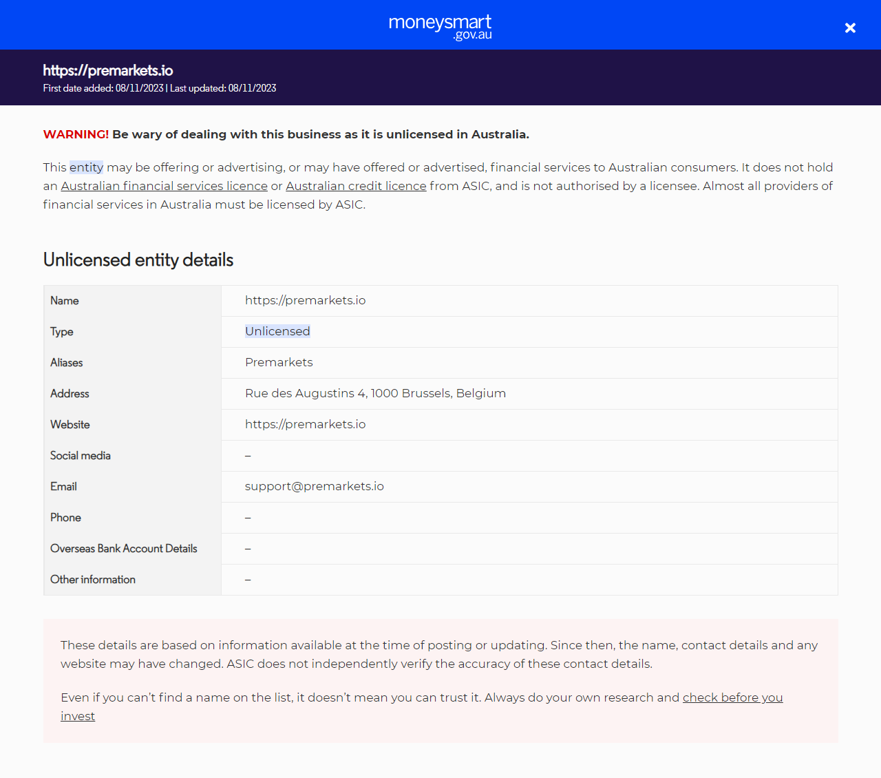 Nombrehttps://premarkets.io TipoOfrecer servicios financieros (incluyendo productos financieros) a personas en Australia sin licencia. No poseen una licencia de servicios financieros australiana (AFS) o una licencia de crédito australiana de ASIC. AliasPremarkets DirecciónRue des Augustins 4, 1000 Bruselas, Bélgica Sitio webhttps://premarkets.io Redes sociales– Correos electrónicosupport@premarkets.io Teléfono– Detalles de cuenta bancaria en el extranjero– Otra información–.