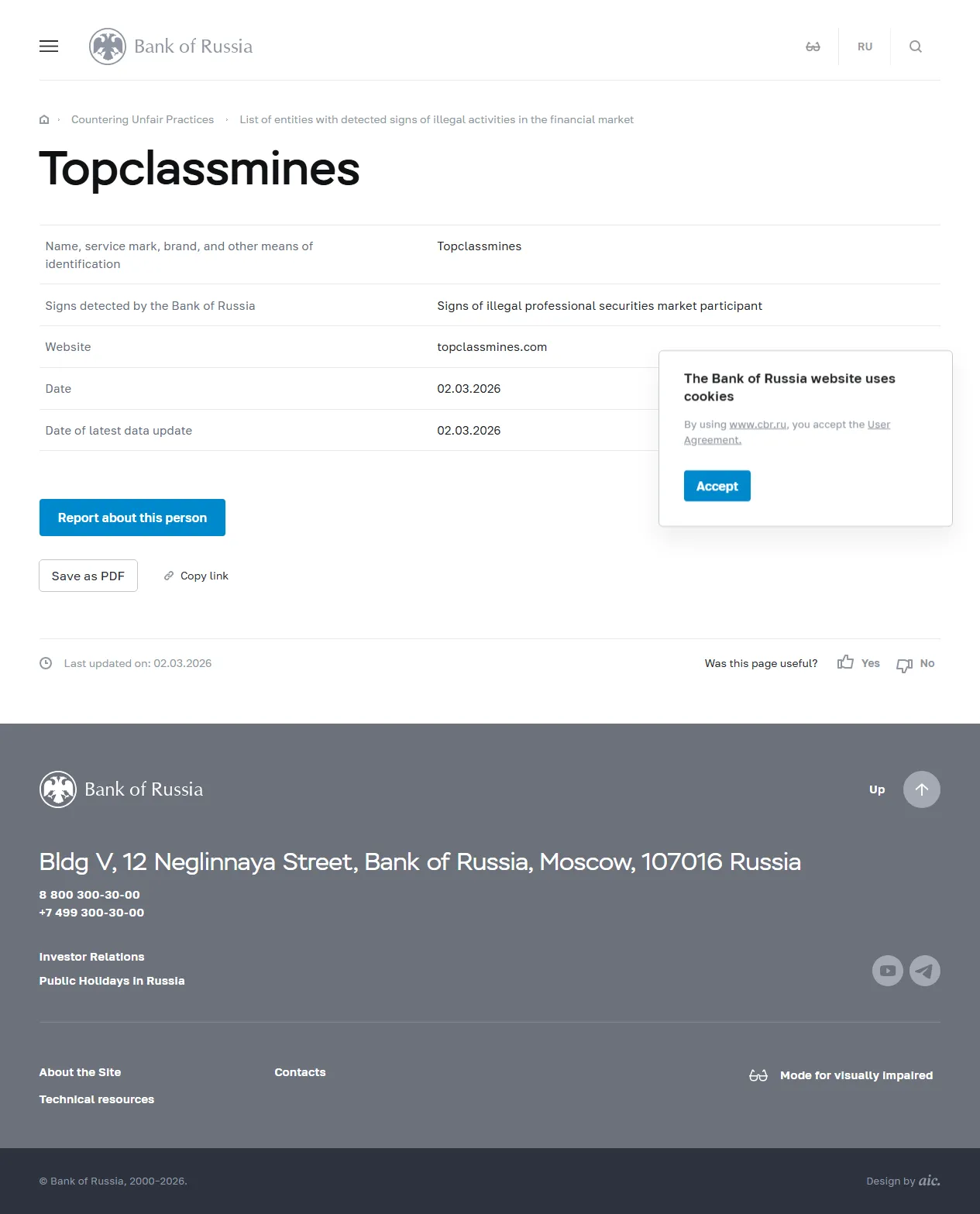 Nombre, marca de servicio, marca comercial y otros medios de identificación Topclassmines Signos detectados por el Banco de Rusia Signos de participante ilegal profesional en el mercado de valores Sitio web topclassmines.com Fecha 02.03.2026 Fecha de la última actualización de datos 02.03.2026.