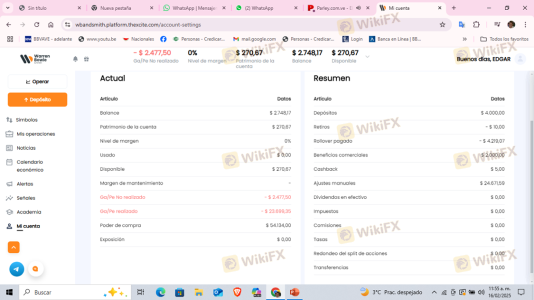 Estuve operando más de un año con Warren & Smith y finalmente no pude retirar mi dinero; son una banda de delincuentes y estafadores. Después de revisar sus referencias, me di cuenta, que no están regulados. La señal no esta conectada a la bolsa de valores, son distintas las señales, manipulan las señales. Al querer cerrar operaciones porque vas ganando, te sacan de la plataforma, los supuestos operadores te manipulan para hacer perder tu dinero, y hasta el personal de retiro te manipula. Ofrecen bonos sustanciales, pero para engañarte, no dejan retirar el dinero, te obligan a abrir operaciones para quebrar tu cuenta utilizando psicológicamente a varios asesores. Es una plataforma make-make, es decir, trabajan con el dinero que le roban a los clientes. No tienen que ver nada con la bolsa de valores, si quieres ampliar más información sobre ellos, pregúntale a cualquier IA (inteligencia artificial) si ellos son estafadores y te va a confirmar que son estafadores. NO SE DEJEN ENGAÑAR