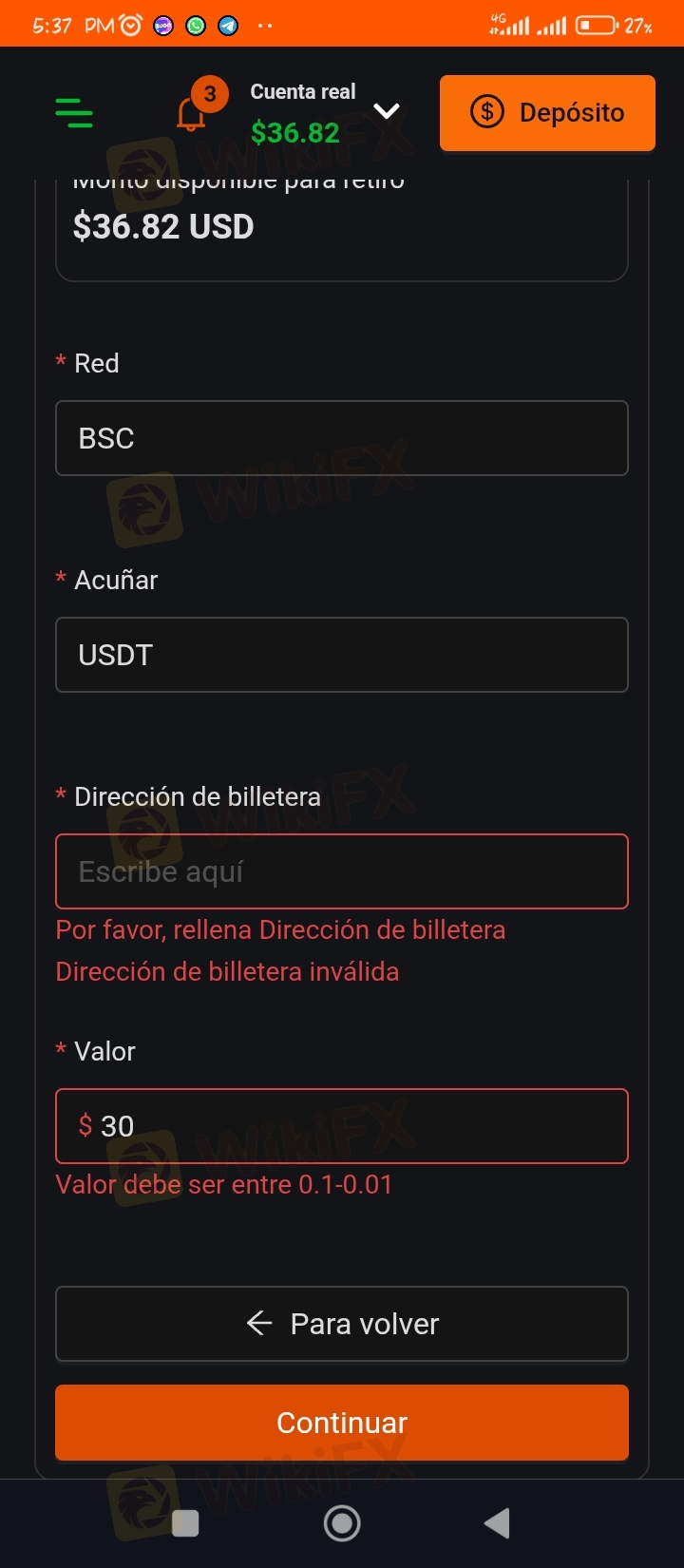 intenté retirar mis fondos pero aparece un mínimo 0.01 y un máximo de 0.1 lo cual no deja colocar los montos de retiro, quedando sin acceso a mis fondos, he notificado a soporte el problema pero sin respuesta