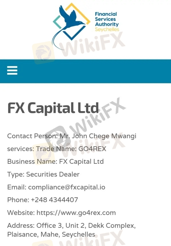 GO4REX pertenece a la empresa FX Capital Ltd, la cual está registrada en Seychelles y dice tener una licencia reglamentaria (no. SD023) emitida por la Autoridad de Servicios Financieros de Seychelles.