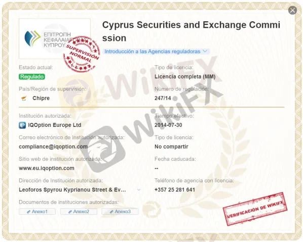 IQ Option está regulado por la comisión de bolsa y valores de chipre (CYSEC) bajo el número de licencia regulatoria de 247/14. sin embargo, es importante tener en cuenta que ha habido algunas quejas y críticas negativas sobre la plataforma, en particular con respecto a los problemas de retiro y atención al cliente.