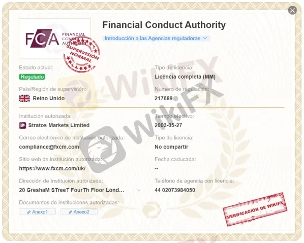 El FXCM está regulado por el ente regulador autorizado Financial Conduct Authority (FCA) con sede en Reino Unido. Número de licencia de bróker 217689. Además, el bróker está autorizado por entidades reguladoras financieras de Australia (ASIC) N° 309763, Sudáfrica (FSCA) N°46534 y Chipre (CYSEC).