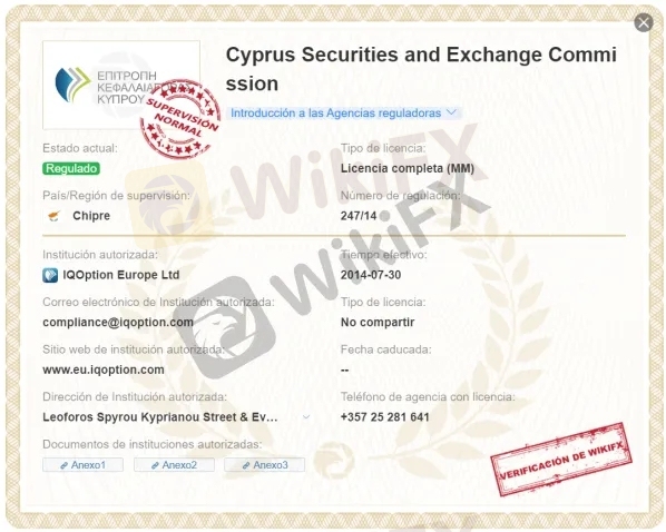 IQ Option pertenece a IQOption LLC y está ubicado en Chipre, donde efectivamente se encuentran sus oficinas, información que ha sido verificada por WikiFX.