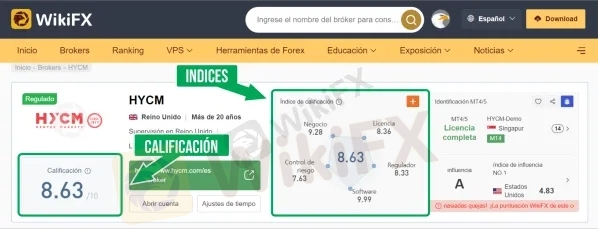 La calificación otorgada por WikiFX a HYCM es de 8.63 / 10.00, lo que lo ubica en el quinto lugar del ranking de brokers de nuestra página.