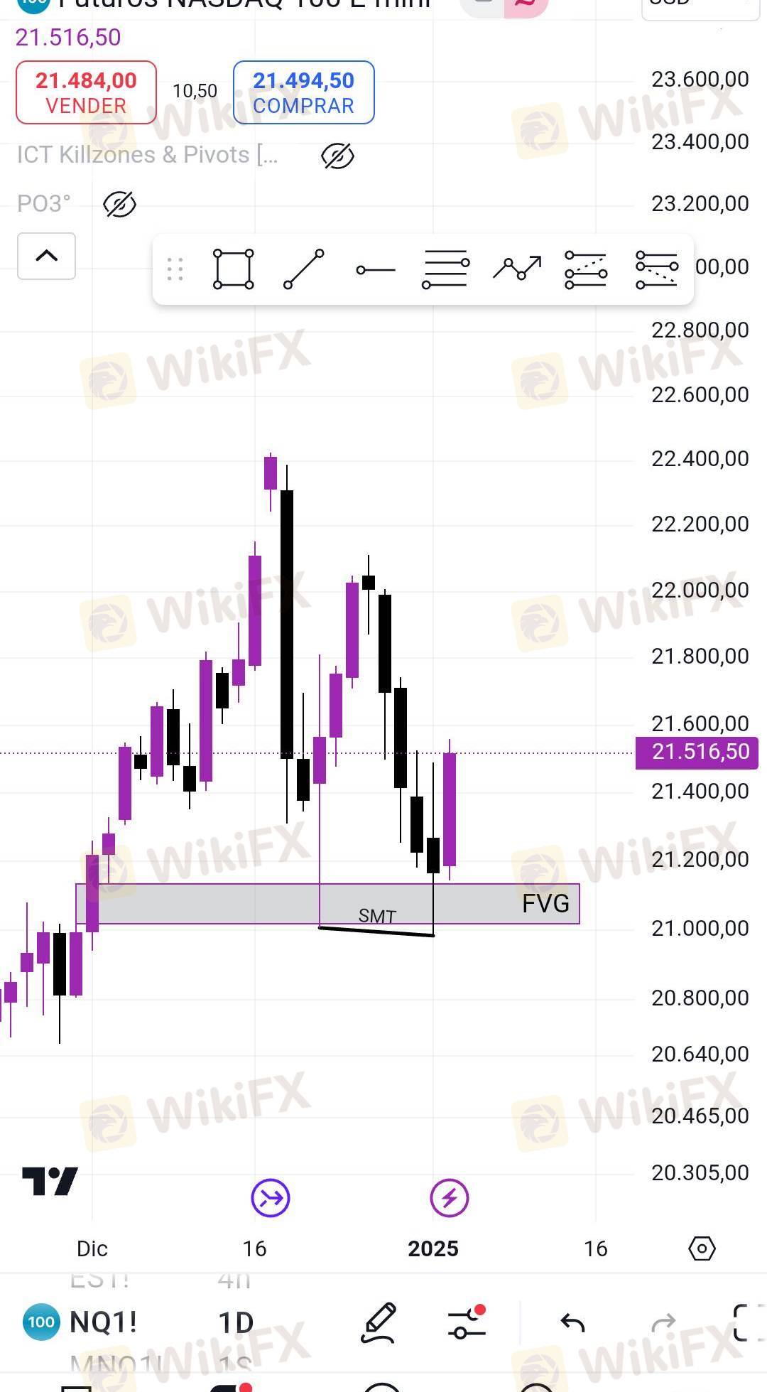 Para el inicio de nuestra primera semana operativa del año 2025, tenemos divergencia SMT en grafico diario entre nasdaq y sp500 en los LOWS dentro de un FVG Diario alcista