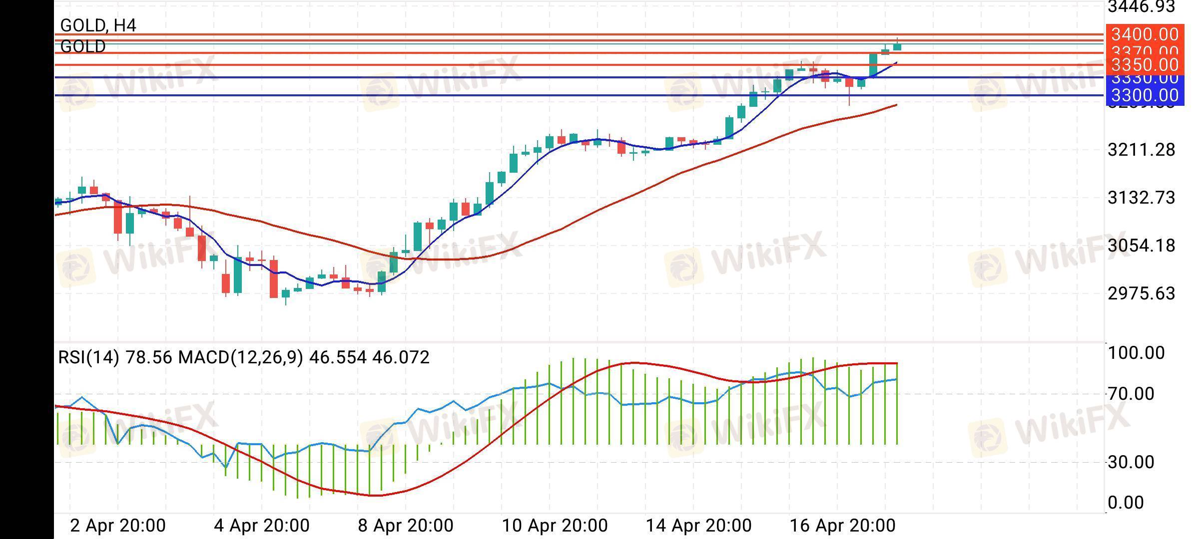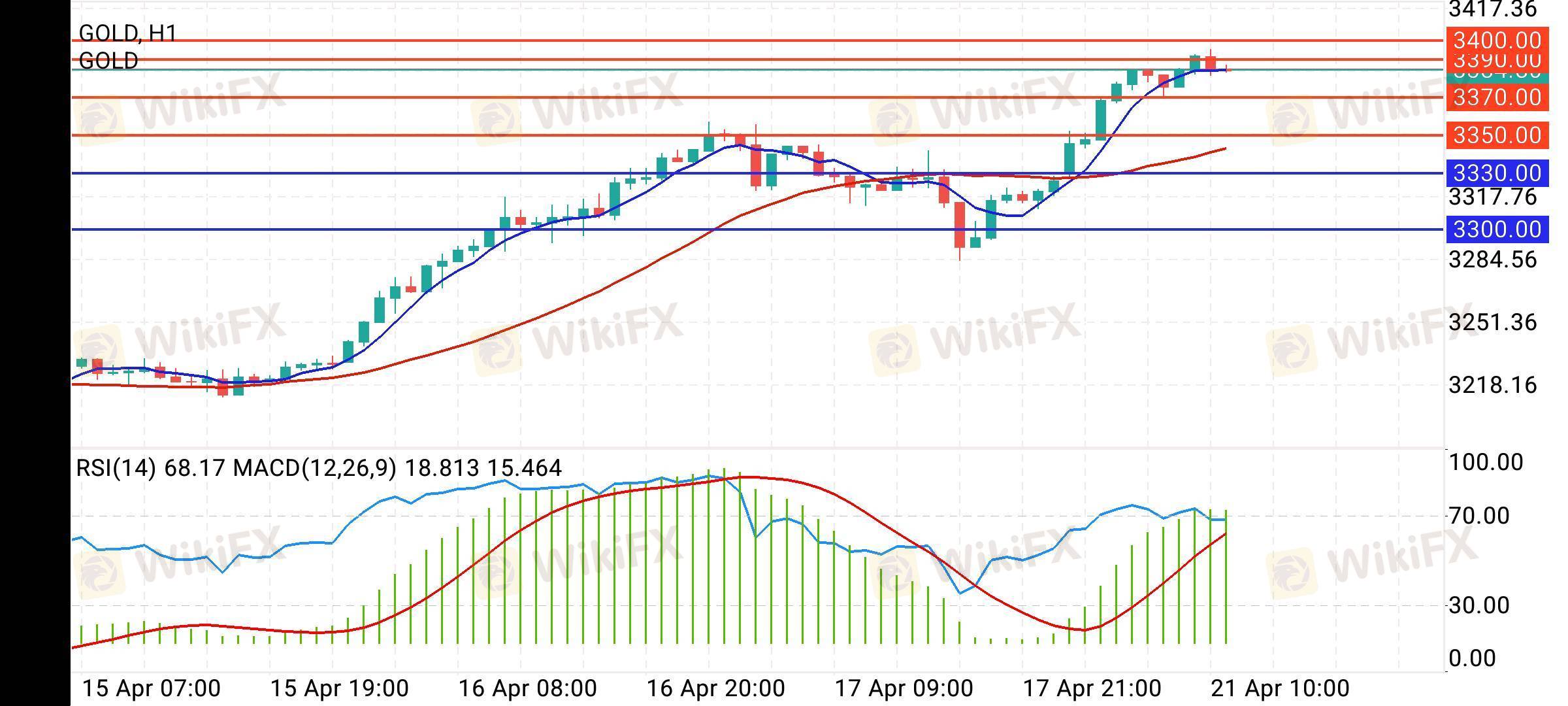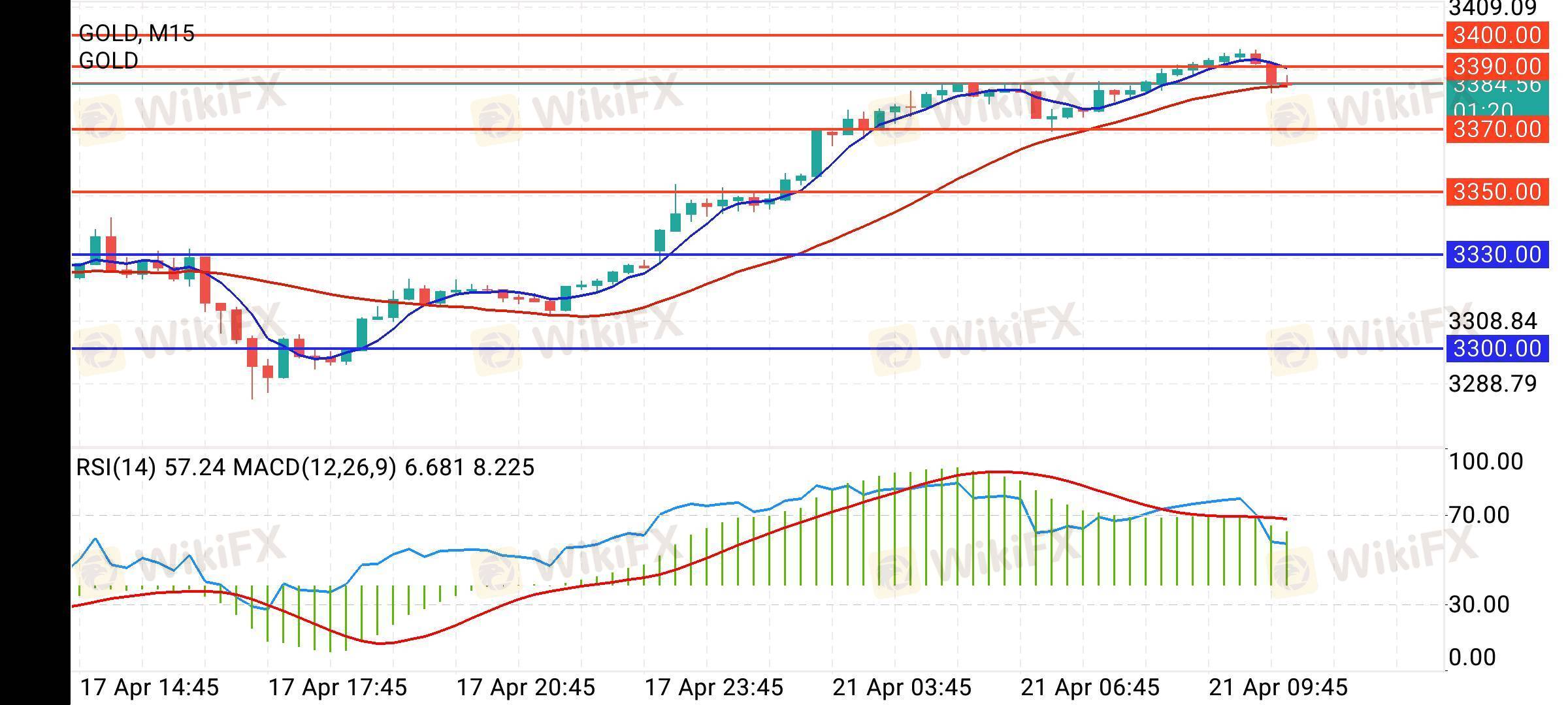 Harga: Sedang menguji resistance 3390 – 3400. Rejeksi kecil mulai terlihat di area tersebut.
