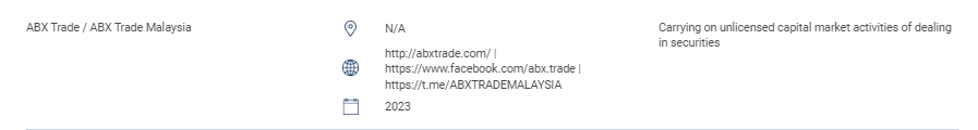 "Esta sección contiene la lista de sitios web no autorizados, productos de inversión, empresas e individuos. Esta lista incluye: personas que realizan o se hacen pasar por realizar las siguientes actividades reguladas sin una licencia de la sc: negociación de valores; negociación de derivados; gestión de fondos, asesoramiento sobre finanzas corporativas, asesoramiento de inversión, planificación financiera y transacciones en planes de jubilación privados, personas que operan un mercado reconocido sin autorización, personas que emiten u ofrecen valores sin aprobación, autorización o reconocimiento, personas que usan indebidamente el logotipo de sc y tergiversan el sc. " ABX TRADE / ABX TRADE malasia n/a http://abxtrade.com/ | https://www.facebook.com/abx.trade | https://t.me/abxtrademalaysia 2023 llevar a cabo actividades de mercado de capitales sin licencia de negociación de valores