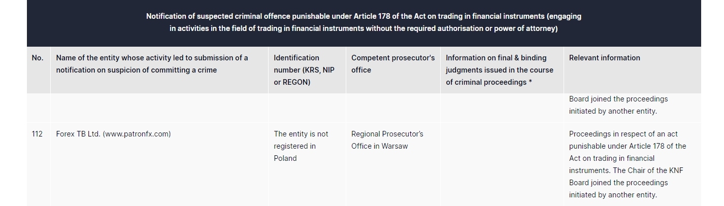 forex tb ltd. (www. PatronFX .com) la entidad no está registrada en la fiscalía regional de polonia en el procedimiento de varsovia con respecto a un acto punible en virtud del artículo 178 de la ley sobre el comercio de instrumentos financieros. el presidente de la junta directiva de la knf se unió al procedimiento iniciado por otra entidad.