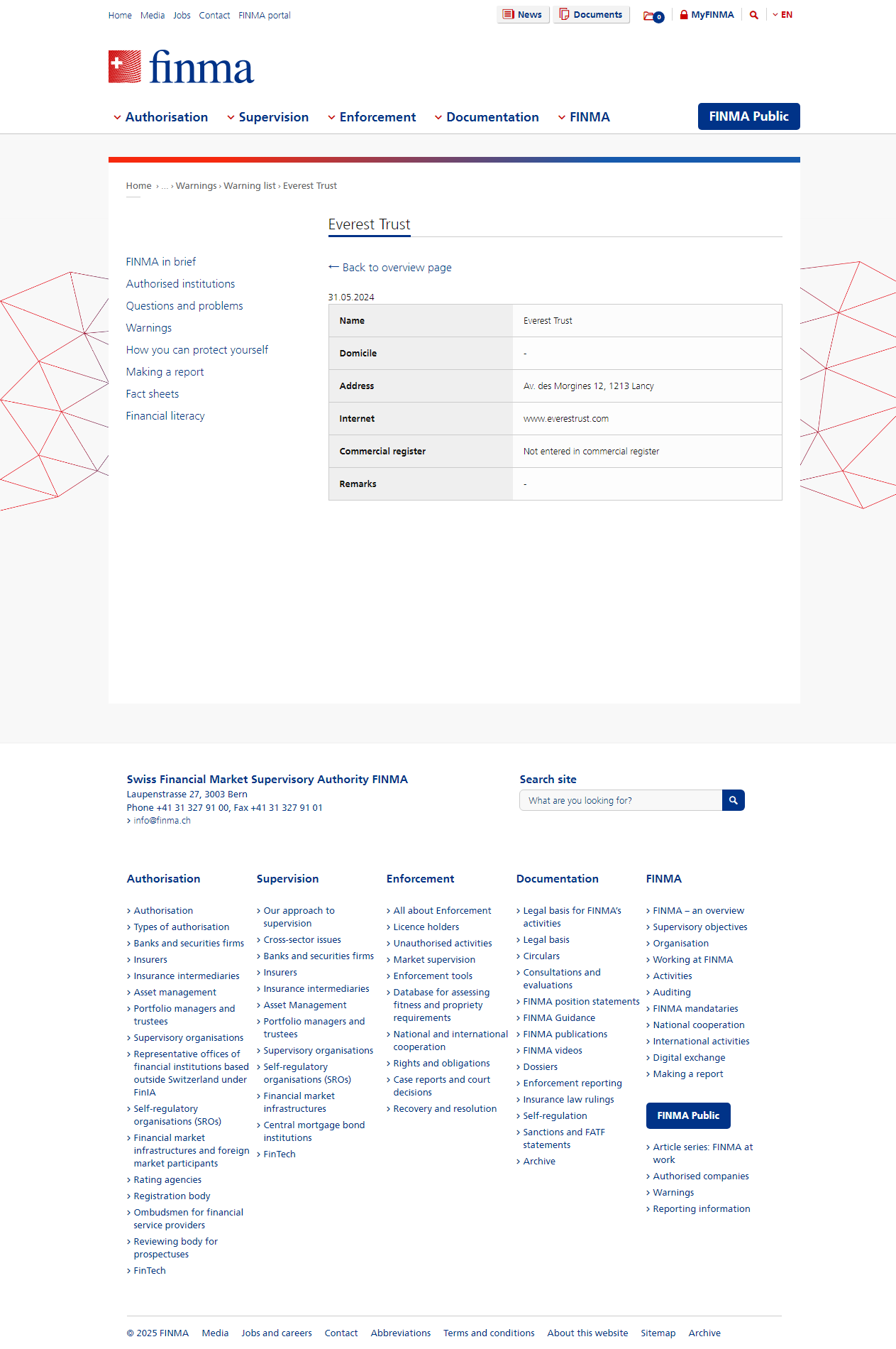 Lista de advertencia de empresas y personas no autorizadas Advertencia pública Lista de advertencia de empresas y personas que podrían estar realizando servicios no autorizados y no están supervisadas por FINMAEverest Trust.