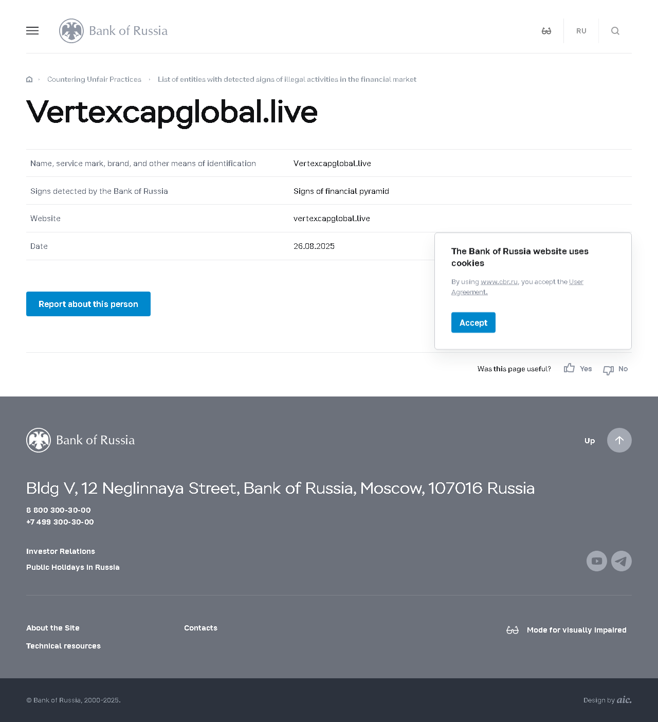 Nombre, marca de servicio, marca comercial y otros medios de identificación Vertexcapglobal.live Señales detectadas por el Banco de Rusia Señales de pirámide financiera Sitio web vertexcapglobal.live Fecha 26.08.2025.