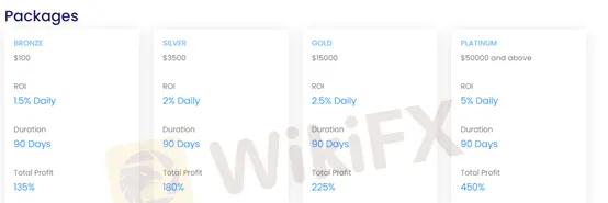 Nag-aalok ang 360 Traders ng isang pakete ng apat na plano sa pamumuhunan upang matugunan ang iba't ibang pangangailangan sa pangangalakal ng mga mangangalakal. Ang pinakamababang deposito para sa bawat plano ay mula sa $100 hanggang $50,000. Ang ilang mga tampok at alok para sa bawat plano ay nakalista sa ibaba:
