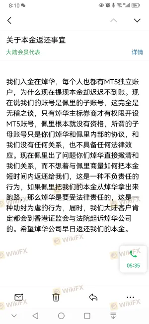 ang sumusunod na liham ay ipinadala sa iyong kumpanya upang sabihin ang mga sumusunod: mula noong kalagitnaan ng Marso 2023, nalaman namin na ang perry capital, na nauugnay sa iyong kumpanya, ay iniimbestigahan ng pulisya ng mainland, at ang mga nauugnay na tauhan at ang mga malaysian executive ni perry ay nakakulong sa ilalim ng pagsisiyasat, at hanggang ngayon, ang kaso ay hindi pa natatapos. pagkatapos ng insidente, nagpadala ka ng sulat sa iyong mainland chinese investors na nagpapaalam sa kanila na huminto sa pangangalakal sa blanchard mt5. kami ay kalmado at nagtitipon sa harap ng hindi inaasahang pangyayaring ito, at naiintindihan namin at nakikipagtulungan kami sa pansamantalang paghawak ng iyong kumpanya. kasabay nito, nakatanggap din kami ng liham mula sa opisyal na back office ni perry na nagpapaalam sa mga mamumuhunan ng pagbabalik ng kanilang mga pangunahing pagbabayad, ngunit hindi namin nakita ang pagpapatupad ng pangako sa pagbabayad na ito mula noong 4.25. kaugnay nito, agad kaming nakipag-ugnayan sa iyong opisyal na serbisyo sa customer at humiling ng agaran at ligtas na refund ng punong-guro ng mga namumuhunan, habang ang lahat ng mga namumuhunan ay nakipag-ugnayan sa iyong opisyal na serbisyo sa customer nang hiwalay sa pamamagitan ng telepono at nagsumite ng kanilang personal na impormasyong nauugnay sa mt5 sa email address ng kumpanya. pagkatapos ng isa pa, humihiling ng refund. gayunpaman, hanggang ngayon, wala pa rin kaming nakikitang positibo at layunin na tugon mula sa iyong kumpanya. in view of the current situation: a statement as follows 1 ang aming investment money ay sa pamamagitan ng deposit address ng kumpanya sa blanchard back office mt5 account, buksan ang iyong official website mt5 personal member page, ang aming deposito, halaga ng deposito, isumite ang withdrawal at iba pa. Ang mga elemento ng impormasyon ay malinaw na nakikita, para sa mga kadahilanang pangseguridad, mayroon kaming kumpletong backup ng mt5 account, ang mga personal na detalye ay nai-save. ang katotohanan na tayo ay isang one-to-one na relasyon sa pagitan ng mamumuhunan at ng tatanggap ng pamumuhunan ay nagtatag ng katotohanan na ang mamumuhunan at iyong kumpanya ay ang eksaktong mga katangian ng relasyon sa pagitan ng dalawang partido. lahat ng mga pagbabayad ng mamumuhunan ay nasa iyong personal na account sa likod ng opisina at malinaw na masusubaybayan. 3 ang natukoy namin ay ginagamit lang ni perry ang iyong deposito na address upang makisali at kumpletuhin ang financing ng principal ng aming mga namumuhunan. ang kumpanya ay kumilos bilang isang tagapamagitan. tulad ng isang tagapagpahiram sa bangko at isang nangangailangang nanghihiram na kumpletuhin ang isang matagumpay na pagtutugma sa isang tagapamagitan, ang bangko at ang indibidwal ay bumubuo ng isang independiyenteng sibil na legal na pagkilos ng mga karapatan at obligasyon, at ang tagapamagitan ay hindi na kumikilos bilang isang tseke sa magkabilang panig. samakatuwid, ang iyong kumpanya ay may ganap na independiyenteng legal na obligasyon na pasanin ang lahat ng mga responsibilidad sa mga namumuhunan, pabayaan ang anumang dahilan, anumang dahilan upang talikuran ang responsibilidad na ito. 4 binanggit mo si perry, tiyak na walang duda na hindi namin alam ang kumpanyang ito. hindi namin kailanman, at hindi kailanman, ikredito ang alinman sa aming mga pondo sa pamumuhunan sa alinman sa mga kumpanya ng pamamahala, na isang kinakailangang hakbang upang matiyak ang kaligtasan ng mga pondo ng aming mga namumuhunan. bukod pa rito, hindi pa kami nakatanggap ng deposito mula sa ibang address sa perry gaya ng iyong nabanggit. napatunayan na tayong mga investors, ay walang materyal na pakikitungo sa tinatawag na perry. ito ay dahil hindi kami naglipat ng mga pondo sa anumang hiwalay na account ng perry. 5 sinabi ng iyong customer service: "ang pag-withdraw ng mga pondo ay ililipat din mula sa blanchworth patungo sa perry at pagkatapos ay babayaran sa mamumuhunan", dahil hindi pa alam at ganap na nauunawaan ng mga mamumuhunan ang detalyadong kahulugan ng kasunduan sa pag-withdraw ng mga pondo sa mga tuntunin ng pakikipagtulungan sa pagitan ng iyong kumpanya at perry, lalo na sa panahong ito ng hindi pangkaraniwang mga pangyayari, kami bilang mga customer ng pamumuhunan at pamamahala sa pananalapi ng blanchworth, ang aming kagyat na alalahanin ay ang punong-guro ito ang aming kagyat na alalahanin na ang punong-guro ay dapat ibalik sa mga mamumuhunan nang buo at ligtas, kung paano harapin ito at kung paano ito lutasin, na lahat ng bagay ay nasa saklaw ng responsibilidad ng iyong kumpanya. 2 ang aming kahilingan at ang iyong responsibilidad 1 perry ay kasalukuyang iniimbestigahan ng Chinese police at ang kaso ay nakabinbin pa rin. 2 maging alerto sa katotohanan na ang dalawang malay na matataas na opisyal ng perry ay nakapiyansa at tumakas sa bansa, kaya nagdulot ng pagbabago sa paglilipat ng pondo ng mga mamumuhunan sa account ni perry. Ang lisensya sa regulasyon ni 3 perry ay binago noong Abril 28, 2023. mangyaring suriin sa lalong madaling panahon at gumawa ng pagtatasa ng panganib para sa interes ng mga mamumuhunan at gumawa ng mapagpasyahan at walang palya na pagkilos. dahil sa mga nasa itaas at iba pang mga panganib na maaaring hindi posible, nais naming ipaalala sa iyo at hilingin sa iyong huwag maglipat ng anumang mga pondo sa perry sa ngayon. isang mainland chinese investors at hong kong Chancellor Precious Metals limitado ang relasyon sa pagitan ng mamumuhunan at ng tatanggap ng pamumuhunan, sa pagitan natin ay isang de facto na legal na relasyon sa pagitan ng a at b, at walang kinalaman sa perry capital, ang prinsipal ay dapat pumasok at lumabas doon (ang orihinal na trading profit transfer landas dito walang komento) b ayaw naming makita ay dahil sa kasalukuyan o anumang hinaharap ay maaaring lumitaw b hindi namin nais na makita na ang iyong kumpanya ay dapat na legal na managot sa anumang pagkawala ng punong-guro ng mamum