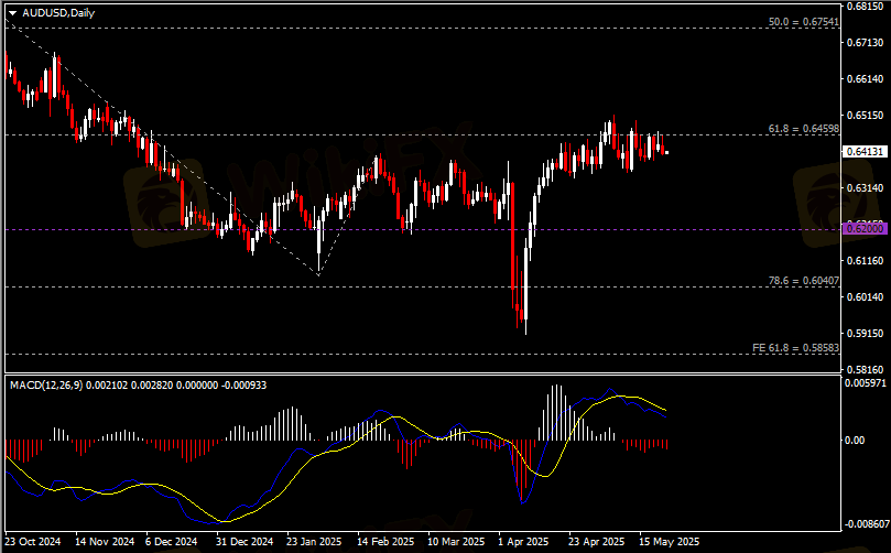 日线图显示澳元兑美元于高位区间震荡,当前承压于0.6460阻力。从MACD来看,快慢线向下运行,红色动能柱恢复放量。汇价走势基本和动能柱的变化一致。
