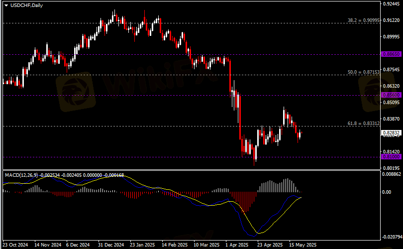 日线图显示美元兑瑞郎反弹上涨,当前仍承压于0.8330阻力。从MACD来看,快慢线欲形成死叉,白色动能柱收缩殆尽。汇价走势和动能柱的变化呈分歧。