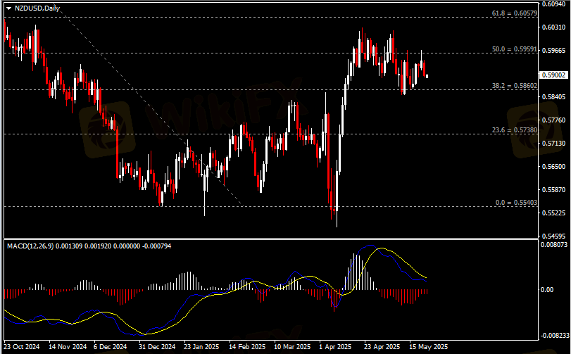 日线图显示纽元兑美元震荡下挫,当前承压于0.5960阻力。从MACD来看,快慢线拐向下行,红色动能柱恢复增量。汇价走势基本和动能柱的变化一致。