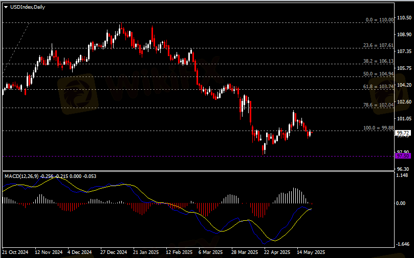 日线图显示美元指数反弹回涨,当前测试99.90阻力。从MACD来看,快慢线形成死叉,白色动能柱收缩殆尽。指数走势和动能柱的变化呈分歧。
