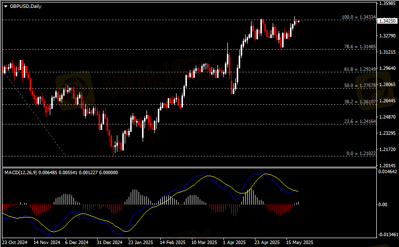 日线图显示英镑兑美元涨势暂缓,当前持续测试1.3430阻力。从MACD来看,快慢线金叉依旧,白色动能柱温和增量。汇价走势和动能柱的变化呈分歧。