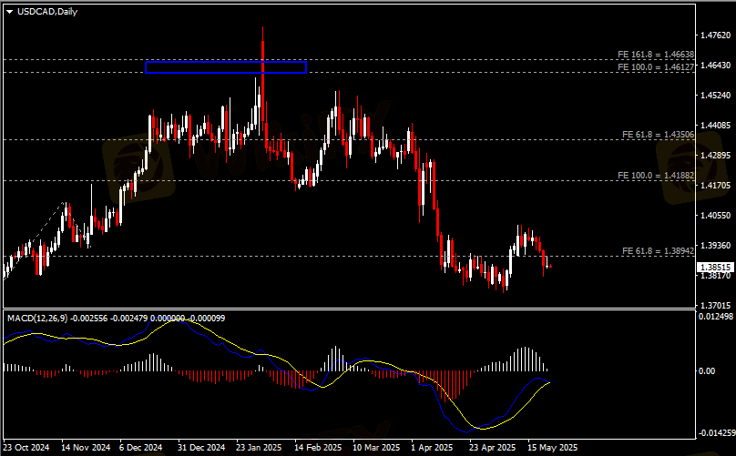 日线图显示美元兑加元回调下挫,当前承压于1.3890阻力。从MACD来看,快慢线欲形成死叉,白色动能柱温和收缩。汇价走势基本和动能柱的变化一致。