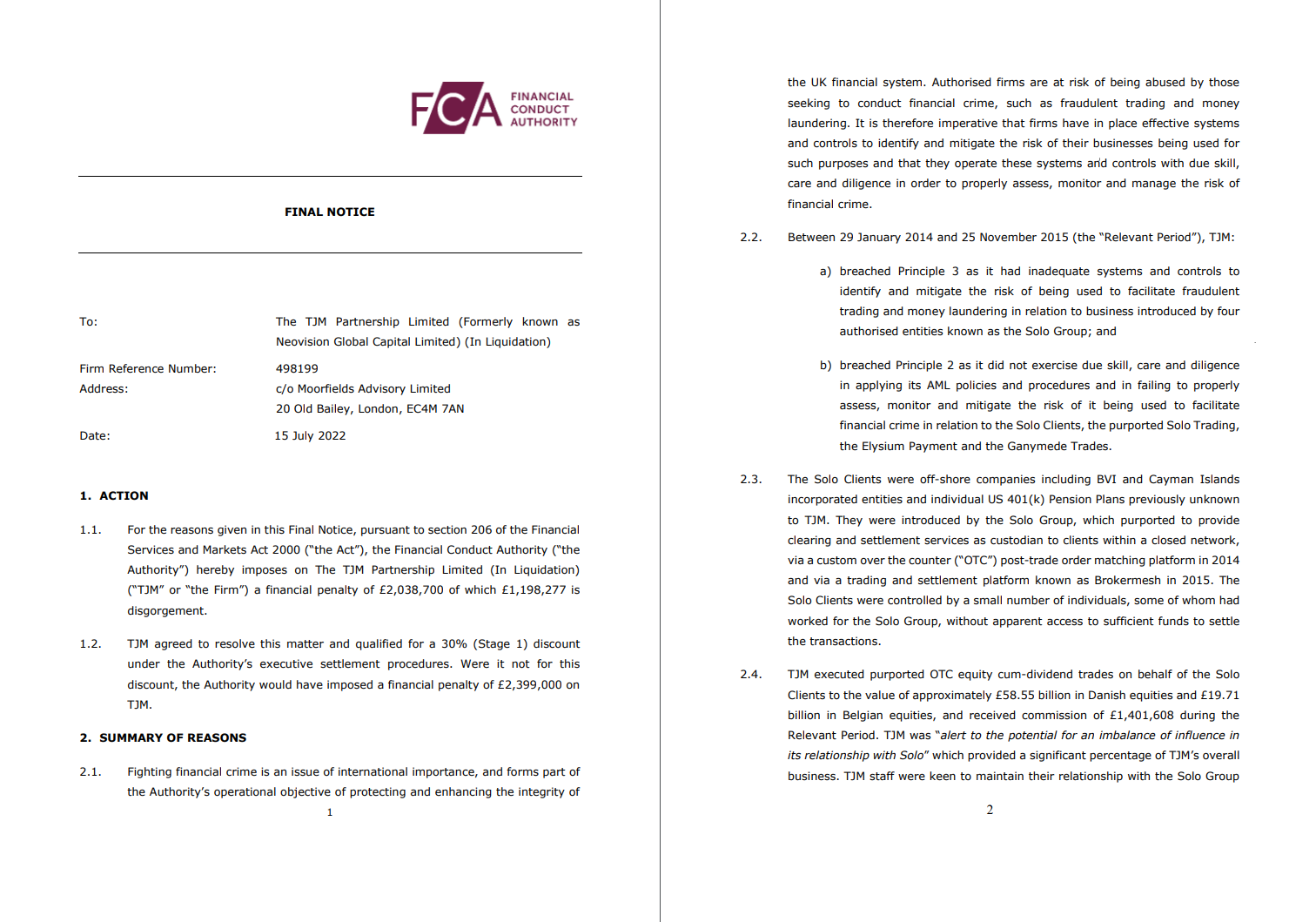 2.2. sa pagitan ng 29 Enero 2014 at 25 ng Nobyembre 2015 (ang “kaugnay na panahon”), TJM : a) nilabag ang prinsipyo 3 dahil mayroon itong hindi sapat na mga sistema at kontrol upang matukoy at mapagaan ang panganib na magamit upang mapadali ang mapanlinlang na kalakalan at money laundering kaugnay ng negosyong ipinakilala ng apat na awtorisadong entity na kilala bilang solo group; at b) lumabag sa prinsipyo 2 dahil hindi ito gumamit ng angkop na kasanayan, pangangalaga at kasipagan sa paglalapat ng mga patakaran at pamamaraan nito at sa pagkabigong maayos na tasahin, subaybayan at pagaanin ang panganib ng paggamit nito upang mapadali ang krimen sa pananalapi kaugnay ng mga solong kliyente , ang sinasabing solo trading, ang elysium payment at ang ganymede trades.