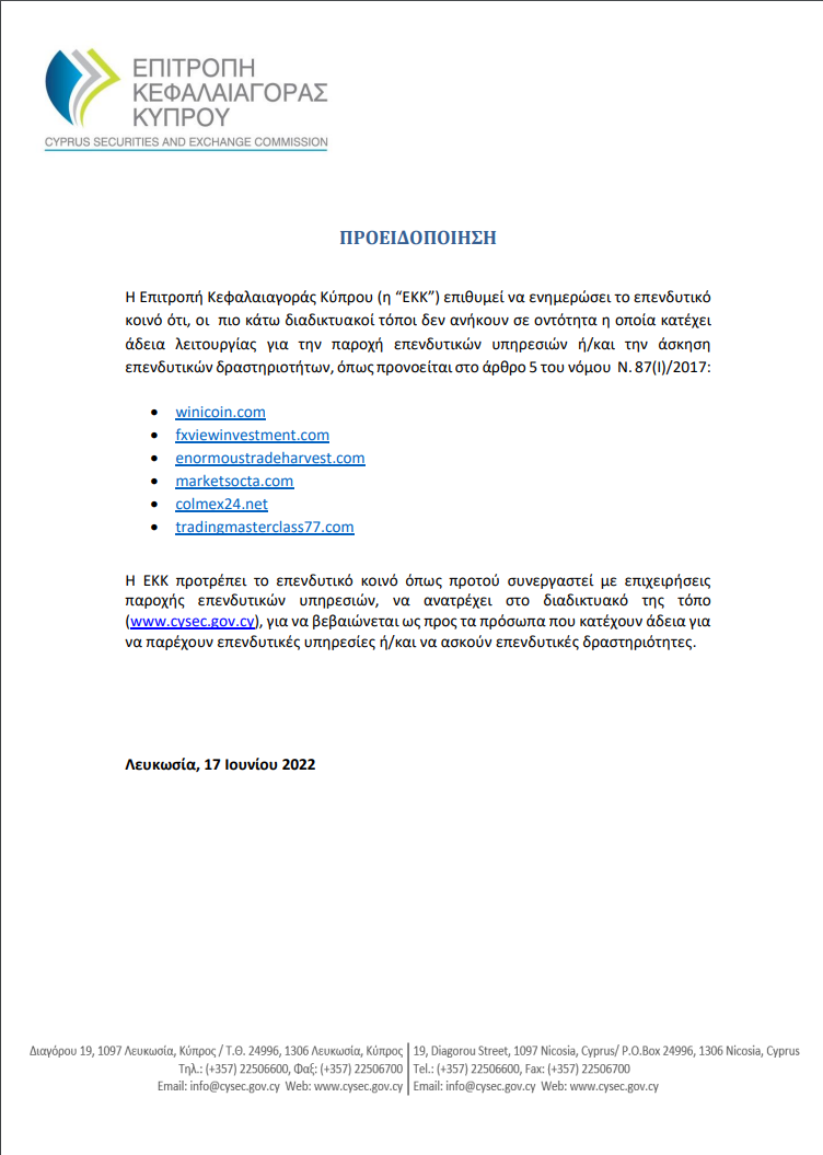 babala sa cyprus securities and exchange commission ('cysec') na gustong ipaalam sa mga mamumuhunan na ang mga sumusunod na website ay hindi kabilang sa isang entity na nabigyan ng awtorisasyon para sa pagbibigay ng mga serbisyo sa pamumuhunan at/o ang pagganap ng mga aktibidad sa pamumuhunan, gaya ng ibinigay para sa sa artikulo 5 ng batas 87 (i)/2017.  winicoin.com  fxviewinvestment.com  enormoustradeharvest.com  marketsocta.com  Colmex 24.net  Tradingmasterclass77 Hinihimok ng .com cysec ang mga mamumuhunan na kumonsulta sa website nito (www.cysec.gov.cy), bago magsagawa ng negosyo sa mga kumpanya ng pamumuhunan, upang matiyak ang mga entidad na may lisensyang magbigay ng mga serbisyo sa pamumuhunan at/o mga aktibidad sa pamumuhunan.