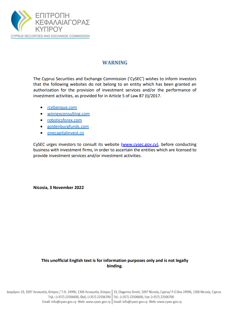 babala sa cyprus securities and exchange commission ('cysec') na gustong ipaalam sa mga mamumuhunan na ang mga sumusunod na website ay hindi kabilang sa isang entity na nabigyan ng awtorisasyon para sa pagbibigay ng mga serbisyo sa pamumuhunan at/o ang pagganap ng mga aktibidad sa pamumuhunan, gaya ng ibinigay para sa sa artikulo 5 ng batas 87 (i)/2017. • rcebanque.com • winnexconsulting.com • RoboticsForex .com • goldenburgfunds.com • hinihimok ng onecapitalinvest.co cysec ang mga mamumuhunan na kumonsulta sa website nito (www.cysec.gov.cy), bago magsagawa ng negosyo sa mga kumpanya ng pamumuhunan, upang matiyak ang mga entity na lisensyado na magbigay ng mga serbisyo sa pamumuhunan at/o mga aktibidad sa pamumuhunan. nicosia, 3 Nobyembre 2022