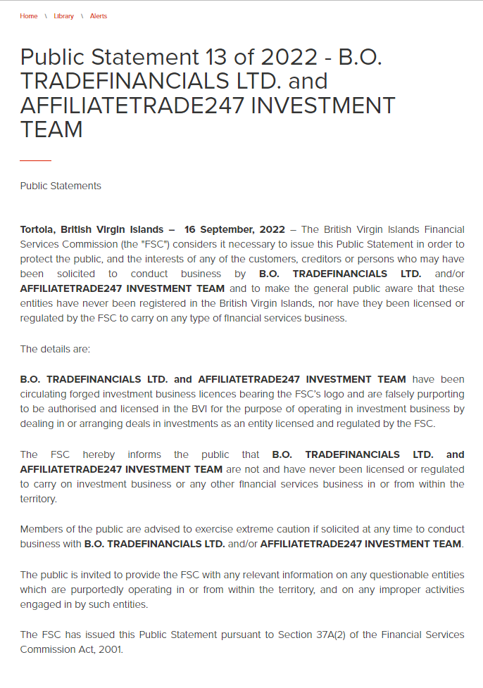 pampublikong pahayag 13 ng 2022 - bo tradefinancials ltd. at Affiliatetrade247 investment team public statements tortola, british virgin islands – 16 september, 2022 – ang british virgin islands financial services commission (ang "fsc") ay isinasaalang-alang na kinakailangang ilabas ang pampublikong pahayag na ito upang maprotektahan ang publiko, at ang mga interes ng alinman sa mga mga customer, nagpapautang o mga tao na maaaring hiniling na magsagawa ng negosyo ng bo tradefinancials ltd. at/o Affiliatetrade247 investment team at upang ipaalam sa pangkalahatang publiko na ang mga entity na ito ay hindi kailanman nakarehistro sa british virgin islands, at hindi rin sila binigyan ng lisensya o kinokontrol ng fsc upang magsagawa ng anumang uri ng negosyong serbisyo sa pananalapi. ang mga detalye ay: bo tradefinancials ltd. at Affiliatetrade247 ang pangkat ng pamumuhunan ay nagpapalipat-lipat ng mga pekeng lisensya sa negosyo sa pamumuhunan na may logo ng fsc at maling sinasabing awtorisado at lisensyado sa bvi para sa layunin ng pagpapatakbo sa negosyo ng pamumuhunan sa pamamagitan ng pakikitungo o pag-aayos ng mga deal sa mga pamumuhunan bilang isang entity na lisensyado at kinokontrol ng fsc . ipinapaalam ng fsc sa publiko na ang bo tradefinancials ltd. at Affiliatetrade247 ang pangkat ng pamumuhunan ay hindi at hindi kailanman binigyan ng lisensya o kinokontrol na magsagawa ng negosyo sa pamumuhunan o anumang iba pang negosyong serbisyo sa pananalapi sa loob o mula sa loob ng teritoryo. pinapayuhan ang mga miyembro ng publiko na mag-ingat kung hihingi sa anumang oras upang magsagawa ng negosyo sa bo tradefinancials ltd. at/o Affiliatetrade247 pangkat ng pamumuhunan. ang publiko ay iniimbitahan na magbigay sa fsc ng anumang may-katuturang impormasyon sa anumang kaduda-dudang entity na sinasabing gumagana sa loob o mula sa loob ng teritoryo, at sa anumang hindi wastong aktibidad na ginagawa ng naturang mga entity. ang fsc ay naglabas ng pampublikong pahayag na ito alinsunod sa seksyon 37a(2) ng batas ng komisyon ng mga serbisyo sa pananalapi, 2001.