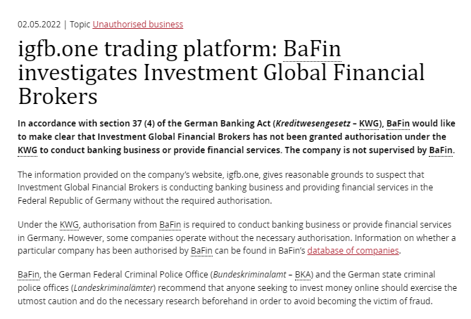 02.05.2022 | paksang hindi awtorisadong negosyo IGFB .one trading platform: iniimbestigahan ng bafin ang mga investment global financial brokers alinsunod sa seksyon 37 (4) ng german banking act (kreditwesengesetz – kwg), nais ni bafin na linawin na ang investment global financial brokers ay hindi nabigyan ng awtorisasyon sa ilalim ng kwg sa magsagawa ng negosyo sa pagbabangko o magbigay ng mga serbisyong pinansyal. ang kumpanya ay hindi pinangangasiwaan ng bafin. ang impormasyong ibinigay sa website ng kumpanya, IGFB .one, ay nagbibigay ng makatwirang batayan upang maghinala na ang pamumuhunan sa pandaigdigang pinansiyal na broker ay nagsasagawa ng negosyo sa pagbabangko at nagbibigay ng mga serbisyong pinansyal sa pederal na republika ng germany nang walang kinakailangang pahintulot. sa ilalim ng kwg, ang pahintulot mula sa bafin ay kinakailangan upang magsagawa ng negosyo sa pagbabangko o magbigay ng mga serbisyong pinansyal sa germany. gayunpaman, ang ilang mga kumpanya ay nagpapatakbo nang walang kinakailangang pahintulot. Ang impormasyon kung ang isang partikular na kumpanya ay pinahintulutan ng bafin ay matatagpuan sa database ng mga kumpanya ng bafin. bafin, ang german federal criminal police office (bundeskriminalamt – bka) at ang german state criminal police offices (landeskriminalämter) ay nagrerekomenda na ang sinumang nagnanais na mamuhunan ng pera online ay dapat mag-ingat nang husto at gawin ang kinakailangang pananaliksik nang maaga upang maiwasang maging biktima ng panloloko.