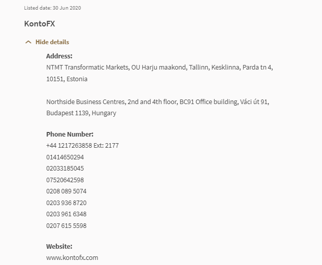 "Listahan ng Alerto ng Mamumuhunan Ang Listahan ng Alerto ng Mamumuhunan ay nagbibigay ng isang listahan ng mga tao na, batay sa impormasyong magagamit ng MAS, i) ay maaaring o maaaring maling napagtanto bilang lisensyado o sa anumang iba pang paraan ay pinahintulutan o kinokontrol ng MAS; ii) ay gumawa isang alok ng mga unit sa isang business trust o collective investment scheme na maaaring o maaaring maling napagtanto bilang awtorisado, kinikilala o nakarehistro ng MAS; iii) nag-alok ng pamumuhunan na maaaring o maaaring maling napagtanto bilang ginawa o sinamahan ng isang dokumentong inilagak o nakarehistro sa MAS. Ang listahang ito ay hindi kumpleto at batay sa kung ano ang alam ng MAS sa oras ng paglalathala." Nakalistang petsa: 30 Hun 2020 KontoFX Itago ang mga detalye Address: NTMT Transformatic Markets, OU Harju maakond, Tallinn, Kesklinna, Parda tn 4, 10151, Estonia Northside Business Centres, 2nd at 4th floor, BC91 Office building, Váci út 9113, Budapest Numero ng Telepono ng Hungary: +44 1217263858 Ext: 2177 01414650294 02033185045 07520642598 0208 089 5074 0203 936 8720 02033185045 07520642598 0208 089 5074 0203 936 8720 01203 4 9 8 www. kontofx.com