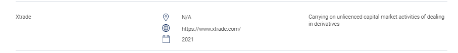 "Ang seksyong ito ay naglalaman ng listahan ng mga hindi awtorisadong website, mga produkto ng pamumuhunan, mga kumpanya at mga indibidwal. Kasama sa listahang ito ang: mga taong nagdadala o nagpapatunay sa kanyang sarili bilang nagsasagawa ng mga sumusunod na kinokontrol na aktibidad nang walang lisensya mula sa sc: pakikitungo sa mga securities; pakikitungo sa mga derivatives; pamamahala ng pondo; pagpapayo sa pananalapi ng korporasyon; payo sa pamumuhunan; pagpaplano sa pananalapi; at pakikitungo sa mga pribadong pamamaraan ng pagreretiro. mga taong nagpapatakbo ng isang kinikilalang merkado nang walang awtorisasyon. mga taong nag-isyu o nag-aalok ng mga securities nang walang pag-apruba, awtorisasyon o pagkilala. mga taong maling ginagamit ang logo ng sc at maling pagkatawan sa sc. " Xtrade n/a https://www. Xtrade .com/ 2021 na nagsasagawa ng walang lisensyang mga aktibidad sa merkado ng kapital ng pakikitungo sa mga derivatives