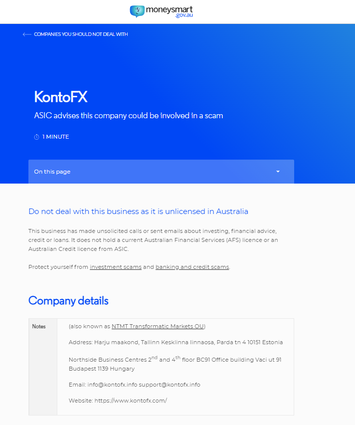 Pinapayuhan ng kontofx asic na ang kumpanyang ito ay maaaring masangkot sa isang scam page na oras ng pagbabasa:1 minuto sa page na ito huwag harapin ang negosyong ito dahil ito ay hindi lisensyado sa australia ang negosyong ito ay gumawa ng mga hindi hinihinging tawag o nagpadala ng mga email tungkol sa pamumuhunan, payo sa pananalapi, kredito o mga pautang . hindi ito nagtataglay ng kasalukuyang lisensya ng australian financial services (afs) o ng australian credit license mula sa asic. protektahan ang iyong sarili mula sa mga scam sa pamumuhunan at banking at credit scam. mga tala ng detalye ng kumpanya (kilala rin bilang NTMT Transformatic Markets OU ) address: harju maakond, tallinn kesklinna iinnaosa, parda tn 4 10151 estonia northside business centers 2nd and 4th floor bc91 office building vaci ut 91 budapest 1139 hungary email: info@kontofx.info support@kontofx.info website: https://www .kontofx.com/