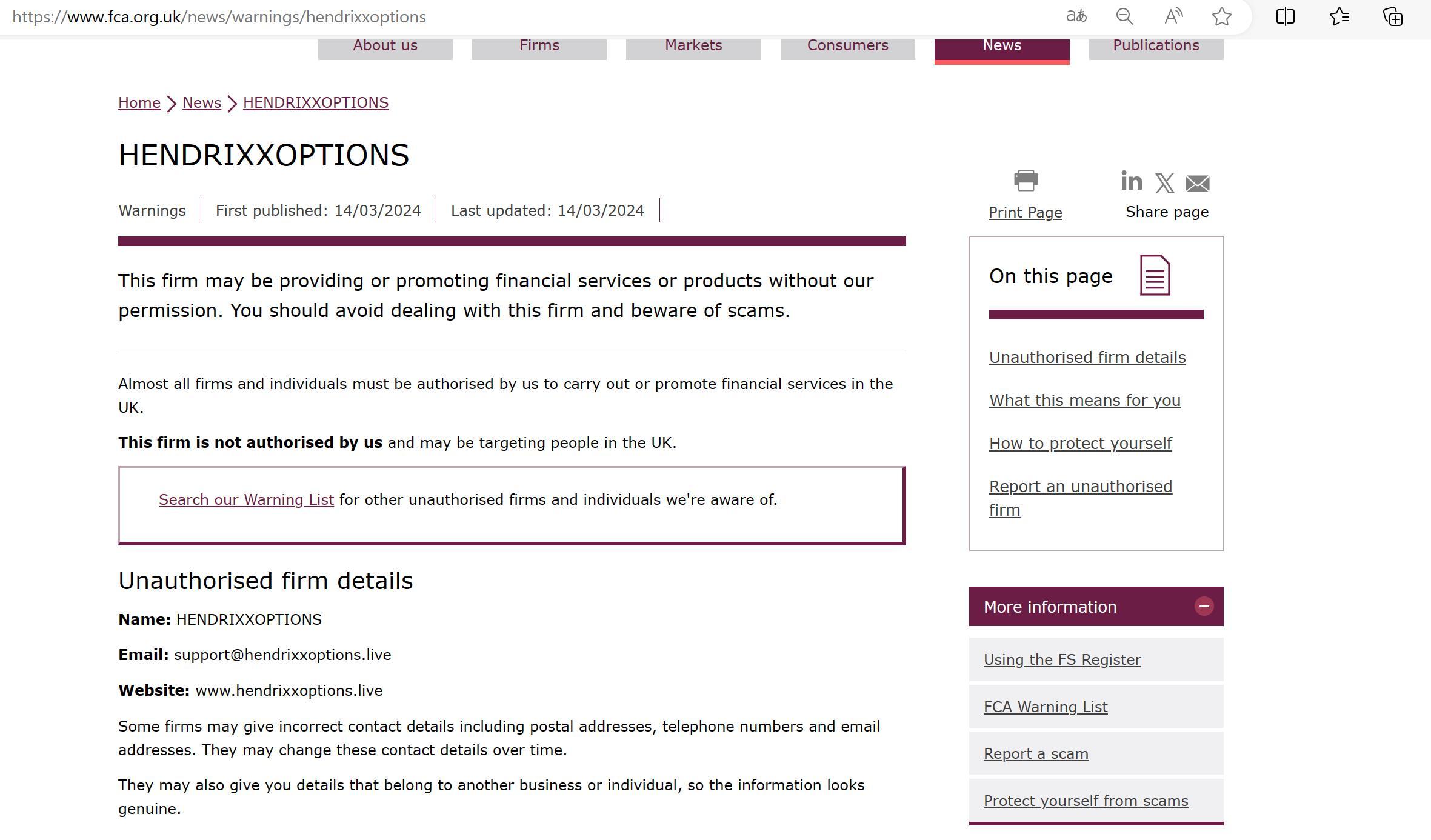Listahan ng Babala ng FCA sa mga hindi awtorisadong kumpanya HENDRIXXOPTIONS.