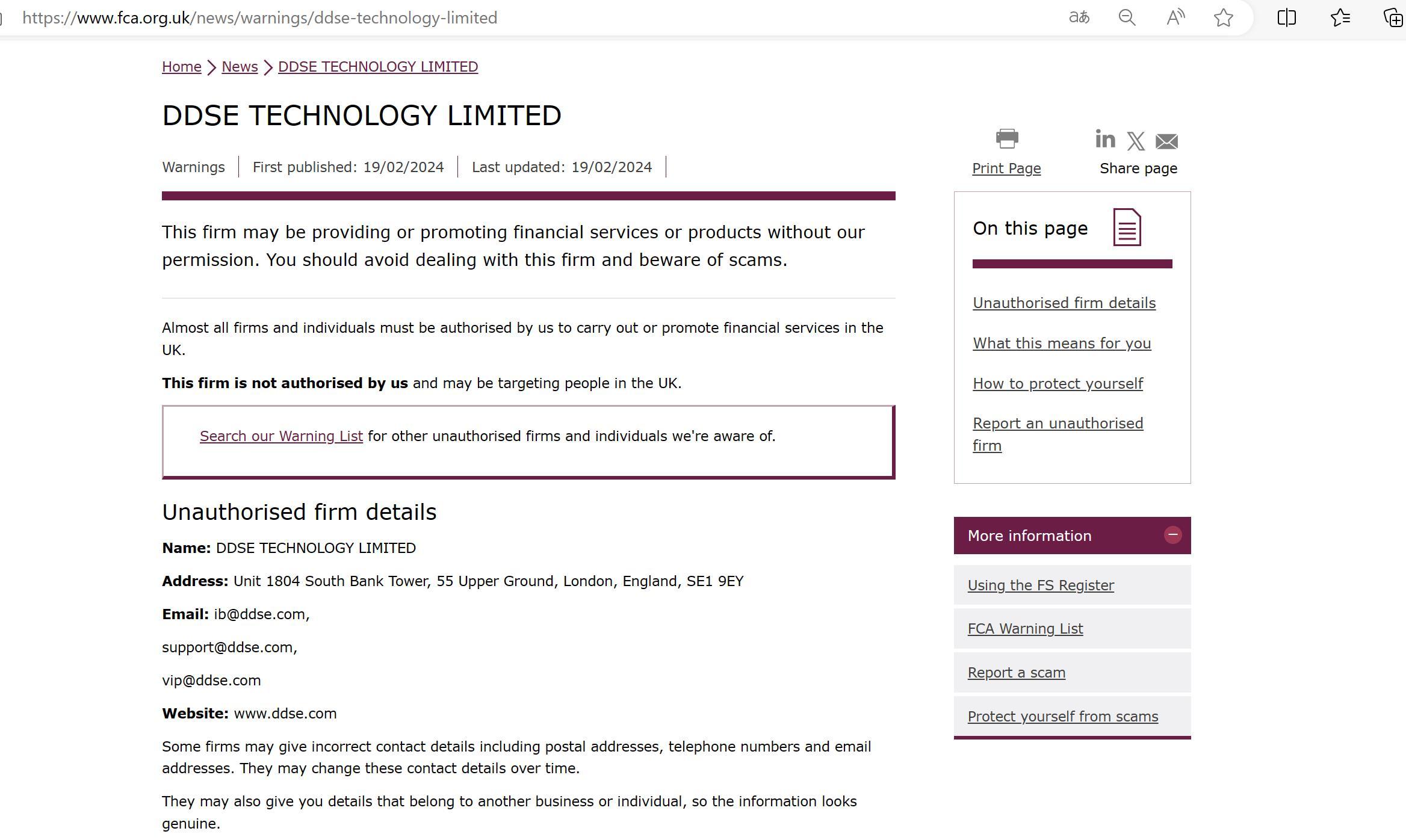 Listahan ng Babala ng FCA ng mga hindi awtorisadong kumpanya DDSE TECHNOLOGY.