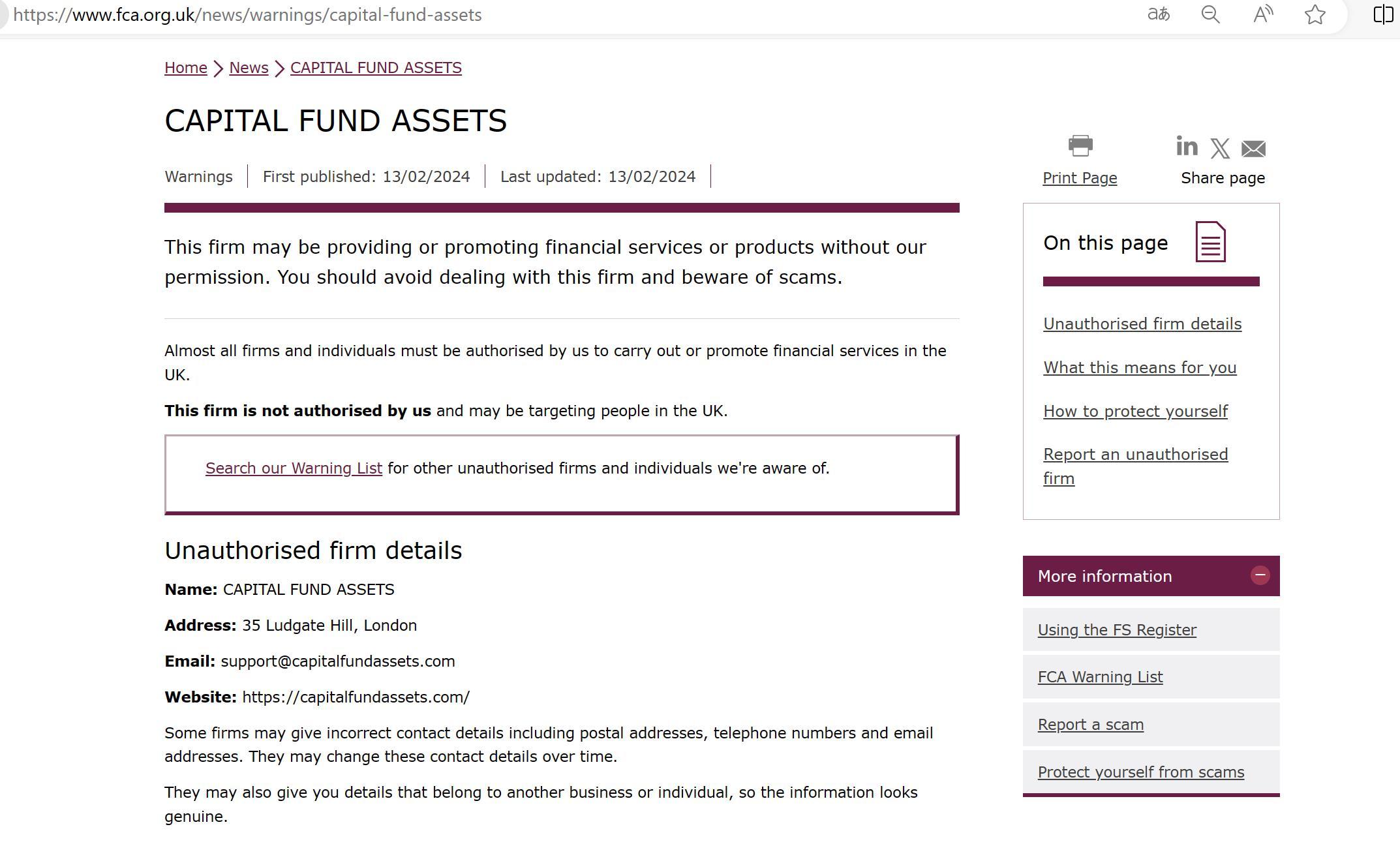 Listahan ng Babala ng FCA ng mga hindi awtorisadong kumpanya CAPITAL FUND ASSETS.