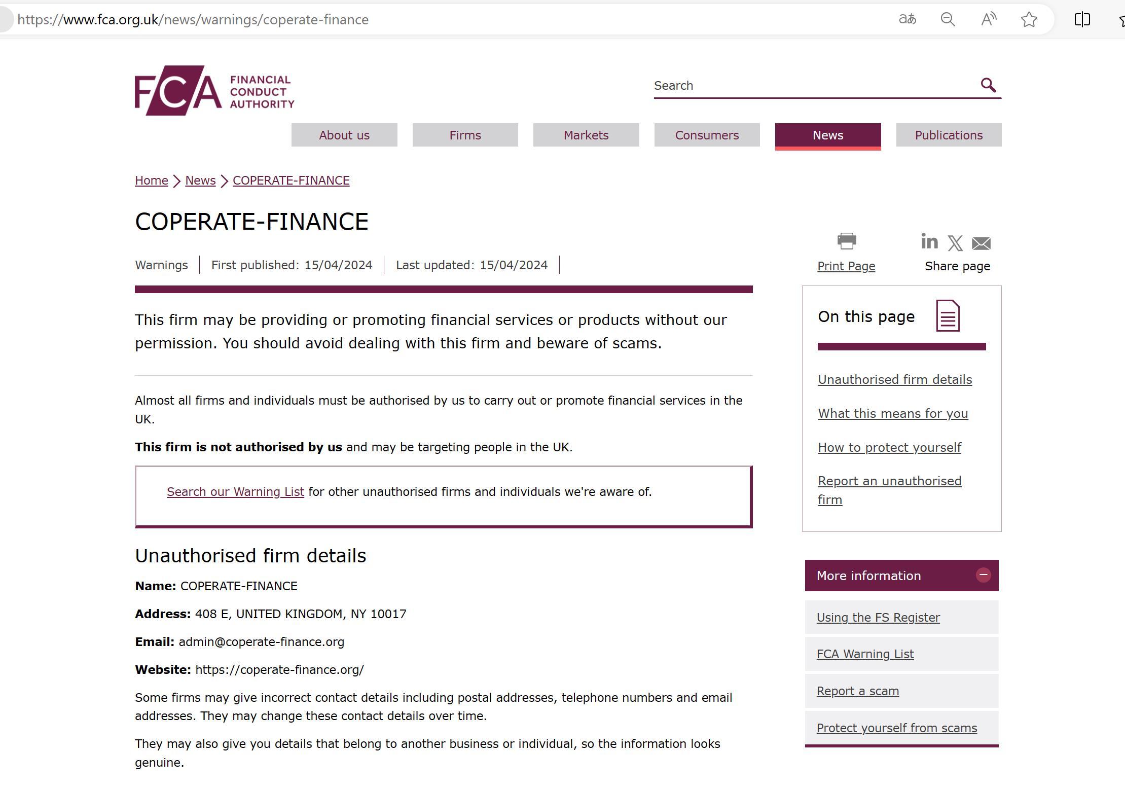 Listahan ng Babala ng FCA sa mga hindi awtorisadong kumpanya COPERATE-FINANCE.