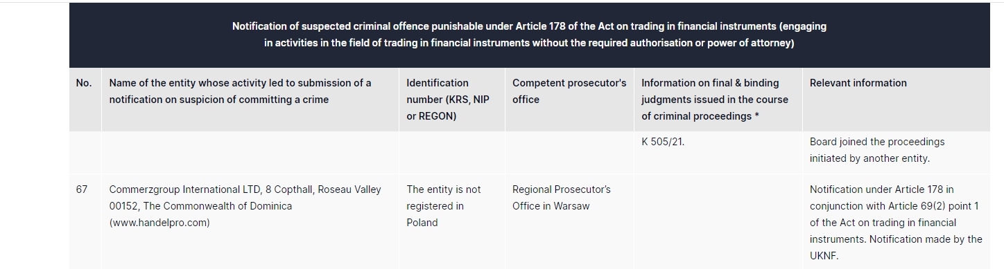 Commerzgroup International LTD, 8 copthall, roseau valley 00152, the commonwealth of dominica (www.handelpro.com) ang entity ay hindi nakarehistro sa poland regional prosecutor's office sa warsaw notification sa ilalim ng artikulo 178 kasabay ng artikulo 69(2) point 1 ng batas sa kalakalan sa mga instrumento sa pananalapi. abiso na ginawa ng uknf.