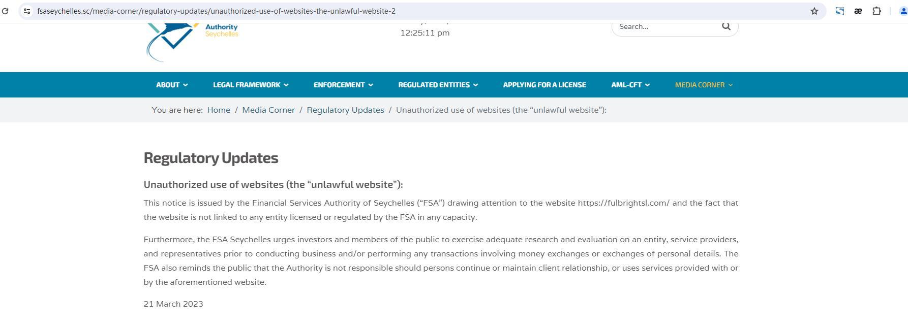 Mga Update sa Regulatoryo Hindi awtorisadong paggamit ng mga website (ang “labag sa batas na website”): Ang abisong ito ay inilabas ng Financial Services Authority of Seychelles (“FSA”) na nagbibigay-pansin sa website https://fulbrightsl.com/ at ang katotohanan na ang website ay hindi naka-link sa anumang entity na lisensyado o kinokontrol ng FSA sa anumang kapasidad. Higit pa rito, hinihimok ng FSA Seychelles ang mga mamumuhunan at miyembro ng publiko na magsagawa ng sapat na pagsasaliksik at pagsusuri sa isang entidad, mga tagapagbigay ng serbisyo, at mga kinatawan bago magsagawa ng negosyo at/o magsagawa ng anumang mga transaksyong may kinalaman sa pagpapalitan ng pera o pagpapalitan ng mga personal na detalye. Ang FSA ay nagpapaalala rin sa publiko na ang Awtoridad ay hindi mananagot kung ang mga tao ay magpatuloy o mapanatili ang relasyon ng kliyente, o gumamit ng mga serbisyong ibinigay kasama ng o ng nabanggit na website. 21 Marso 2023