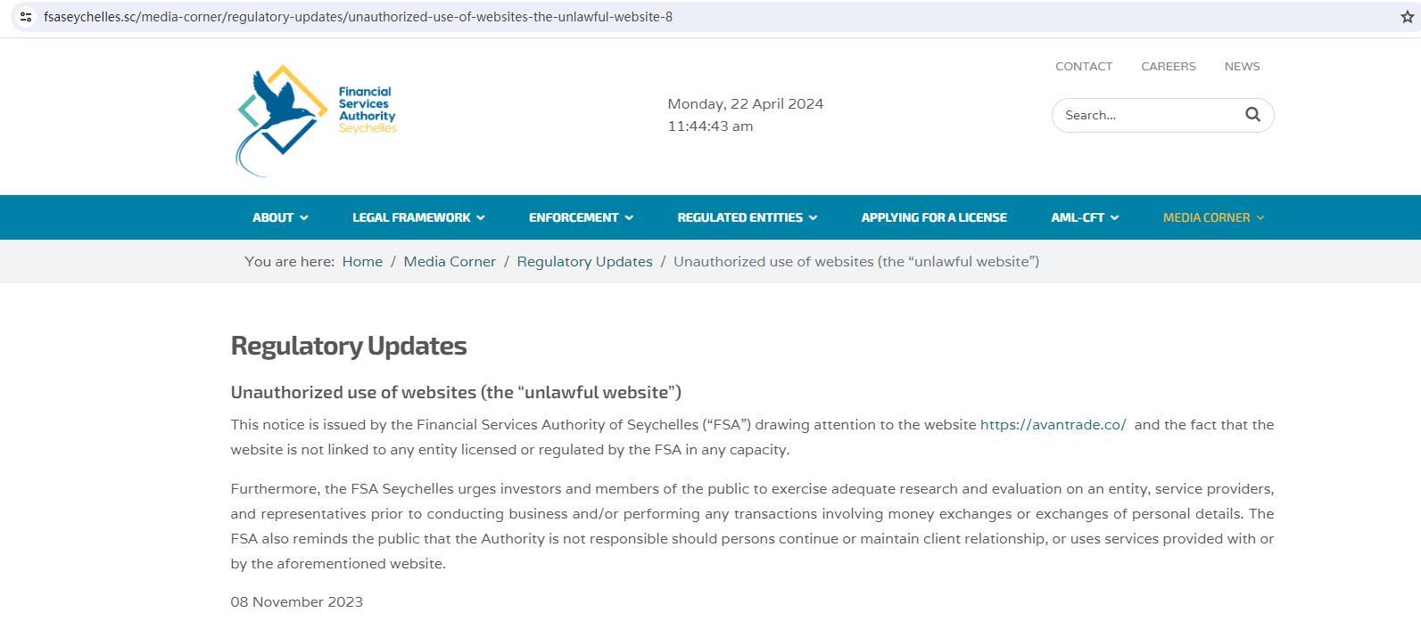 regulasyong pag-update ng hindi awtorisadong paggamit ng mga website (ang “labag sa batas na website”) ang abisong ito ay inisyu ng awtoridad ng mga serbisyo sa pananalapi ng seychelles (“fsa”) na nakakakuha ng pansin sa website https:// AvanTrade .co/ at ang katotohanan na ang website ay hindi naka-link sa anumang entity na lisensyado o kinokontrol ng fsa sa anumang kapasidad. Higit pa rito, hinihimok ng fsa seychelles ang mga mamumuhunan at miyembro ng publiko na magsagawa ng sapat na pagsasaliksik at pagsusuri sa isang entidad, mga tagapagbigay ng serbisyo, at mga kinatawan bago magsagawa ng negosyo at/o magsagawa ng anumang mga transaksyong may kinalaman sa pagpapalitan ng pera o pagpapalitan ng mga personal na detalye. ang fsa ay nagpapaalala rin sa publiko na ang awtoridad ay walang pananagutan kung ang mga tao ay magpatuloy o mapanatili ang relasyon ng kliyente, o gumamit ng mga serbisyong ibinigay kasama ng o ng nabanggit na website. 08 Nobyembre 2023