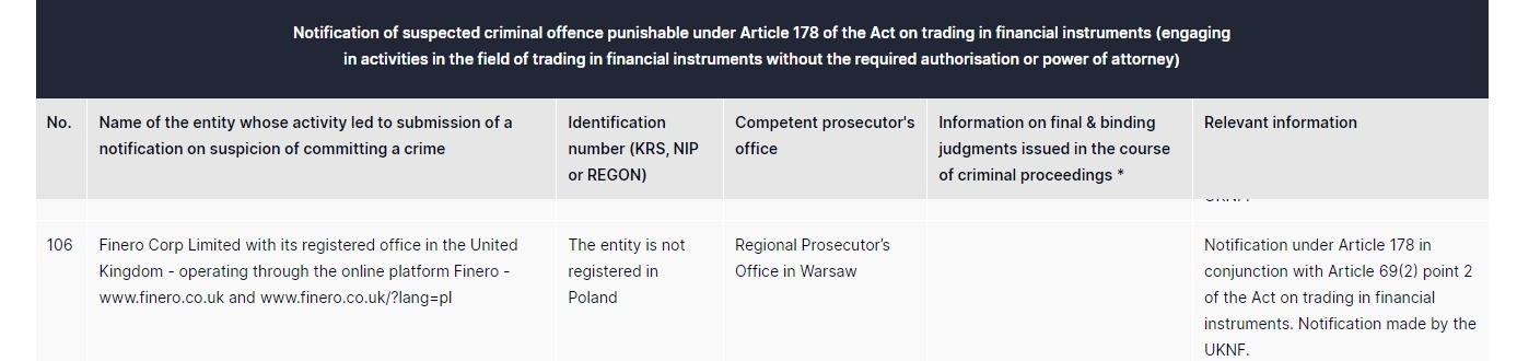Finerocorp limitado sa rehistradong opisina nito sa united kingdom - tumatakbo sa pamamagitan ng online platform Finero - www. Finero .co.uk at www. Finero .co.uk/?lang=pl ang entity ay hindi nakarehistro sa poland regional prosecutor's office sa abiso sa warsaw sa ilalim ng artikulo 178 kasabay ng artikulo 69(2) point 2 ng batas sa pangangalakal ng mga instrumento sa pananalapi. abiso na ginawa ng uknf.