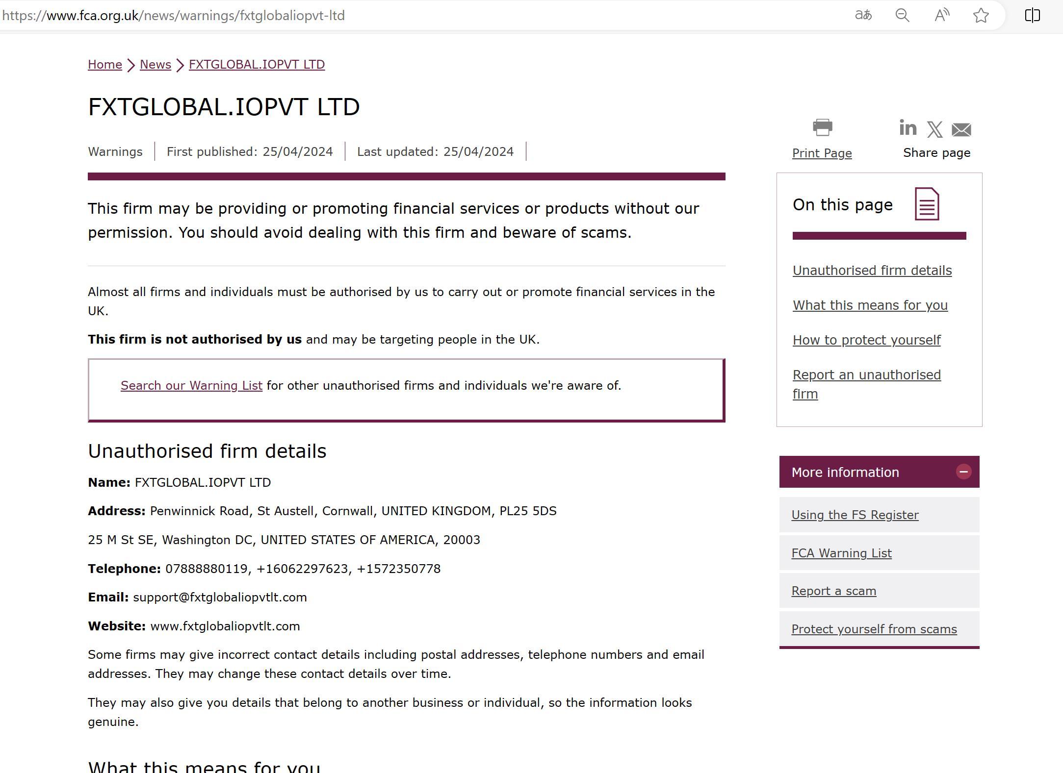 Listahan ng Babala ng FCA ng mga hindi awtorisadong kumpanya FXTGLOBAL.IOPVT LTD.